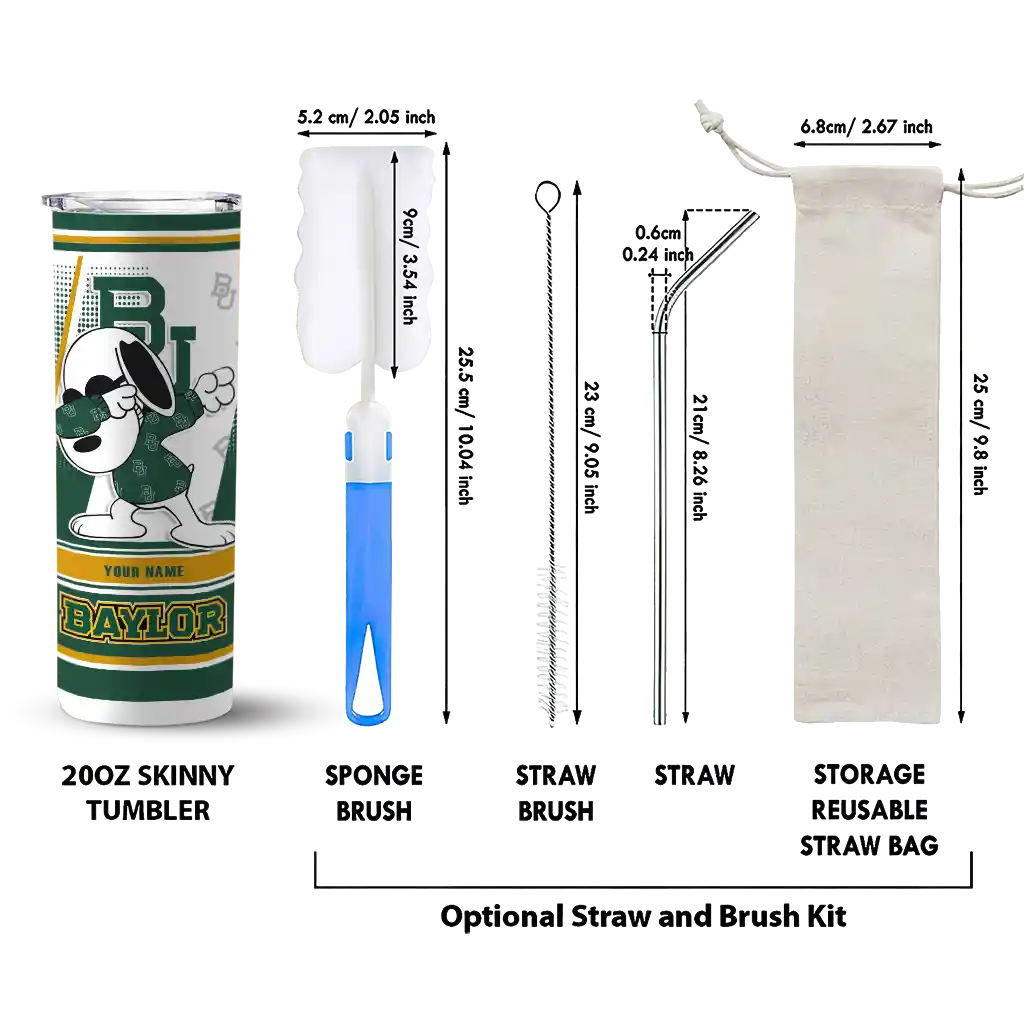 The Custom Baylor Bears Snoopy Dog Green White Skinny Tumbler tumbler is the perfect way to stay refreshed while showing off your pride for Baylor Bears. With its double-wall insulation, your drinks stay at the right temperature for hours, whether you're enjoying a hot coffee or keeping your iced drink cold. What's inside? You’ll find 1 stainless steel tumbler, 1 clear lid, and 1 removable straw. It's the perfect blend of function and fan spirit! Ergonomically designed for comfort, made from durable stainless steel, and insulated to maintain your drink’s temperature, this tumbler is a must-have for any dedicated NCAA fan.