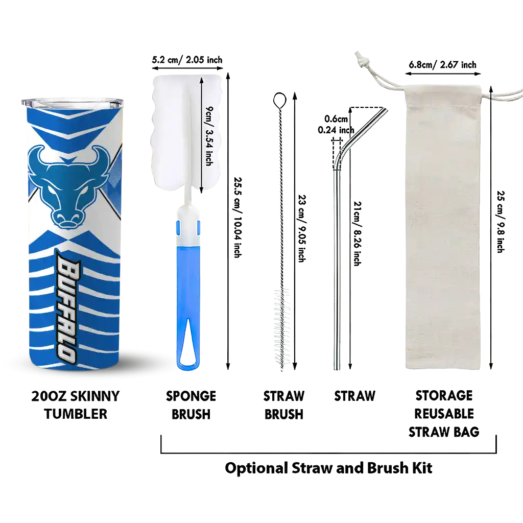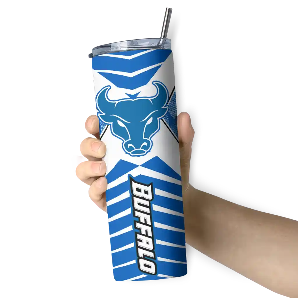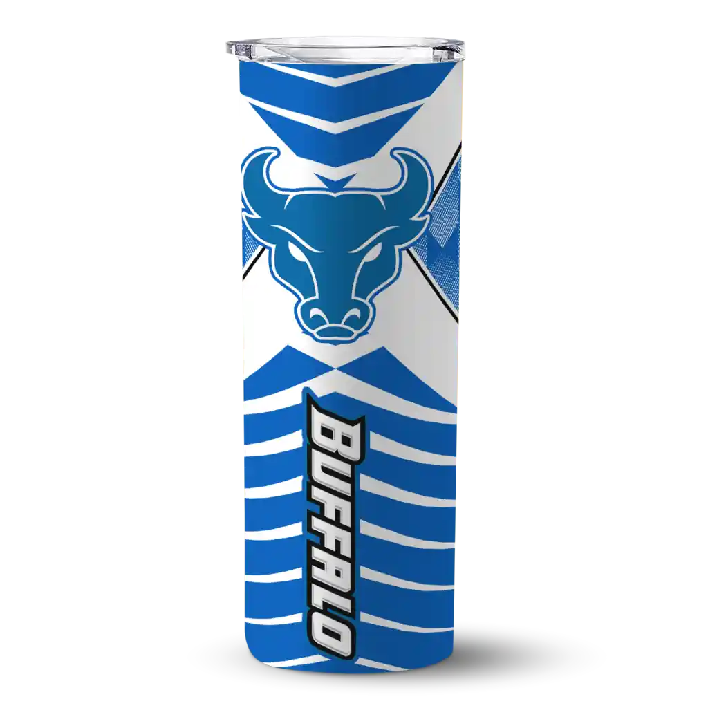 The Customized Buffalo Bulls Monogram Burst Royal Blue White Skinny Tumbler tumbler is the perfect way to stay refreshed while showing off your pride for Buffalo Bulls. With its double-wall insulation, your drinks stay at the right temperature for hours, whether you're enjoying a hot coffee or keeping your iced drink cold. What's inside? You’ll find 1 stainless steel tumbler, 1 clear lid, and 1 removable straw. It's the perfect blend of function and fan spirit! Ergonomically designed for comfort, made from durable stainless steel, and insulated to maintain your drink’s temperature, this tumbler is a must-have for any dedicated NCAA fan.