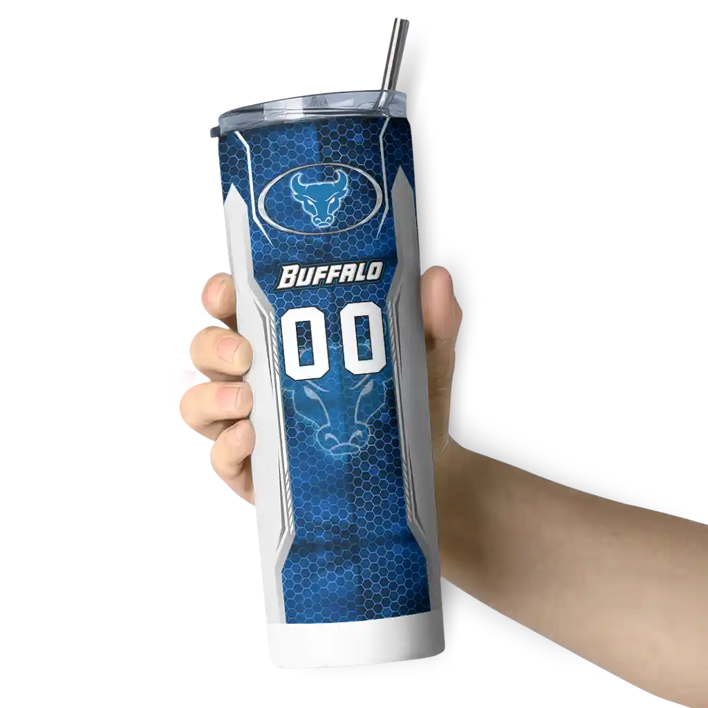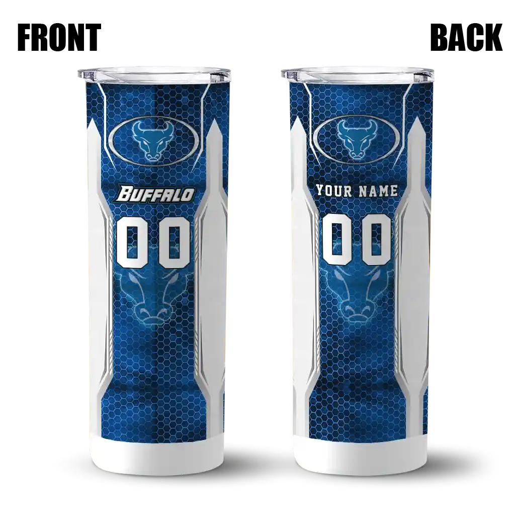 The Customized Buffalo Bulls Monogram Burst Royal Blue White Skinny Tumbler tumbler is the perfect way to stay refreshed while showing off your pride for Buffalo Bulls. With its double-wall insulation, your drinks stay at the right temperature for hours, whether you're enjoying a hot coffee or keeping your iced drink cold. What's inside? You’ll find 1 stainless steel tumbler, 1 clear lid, and 1 removable straw. It's the perfect blend of function and fan spirit! Ergonomically designed for comfort, made from durable stainless steel, and insulated to maintain your drink’s temperature, this tumbler is a must-have for any dedicated NCAA fan.