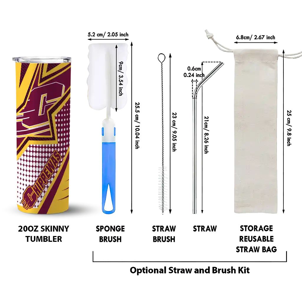 The Central Michigan Chippewas Radiant Glitter Maroon Skinny Tumbler tumbler is the perfect way to stay refreshed while showing off your pride for Central Michigan Chippewas. With its double-wall insulation, your drinks stay at the right temperature for hours, whether you're enjoying a hot coffee or keeping your iced drink cold. What's inside? You’ll find 1 stainless steel tumbler, 1 clear lid, and 1 removable straw. It's the perfect blend of function and fan spirit! Ergonomically designed for comfort, made from durable stainless steel, and insulated to maintain your drink’s temperature, this tumbler is a must-have for any dedicated NCAA fan.