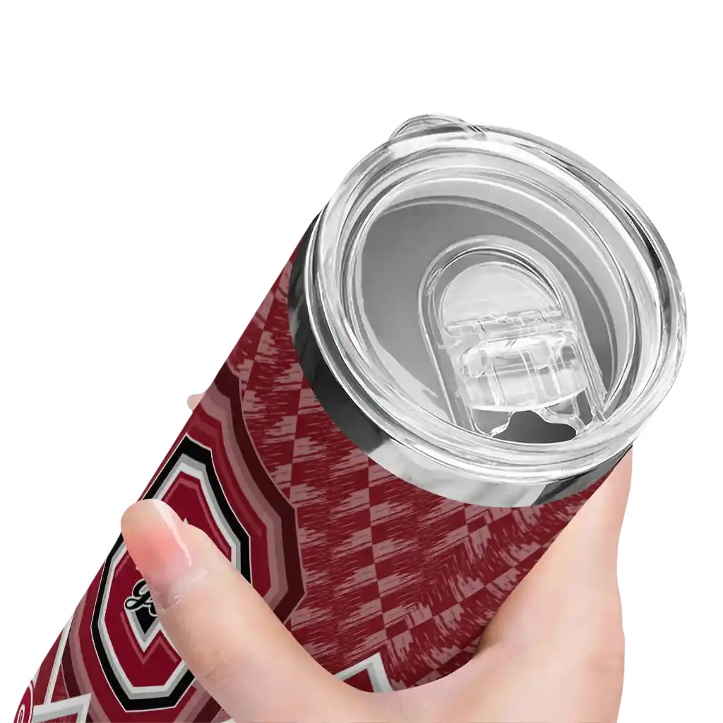 The Custom Colgate Raiders Star Pop Maroon Black Skinny Tumbler tumbler is the perfect way to stay refreshed while showing off your pride for Colgate Raiders. With its double-wall insulation, your drinks stay at the right temperature for hours, whether you're enjoying a hot coffee or keeping your iced drink cold. What's inside? You’ll find 1 stainless steel tumbler, 1 clear lid, and 1 removable straw. It's the perfect blend of function and fan spirit! Ergonomically designed for comfort, made from durable stainless steel, and insulated to maintain your drink’s temperature, this tumbler is a must-have for any dedicated NCAA fan.