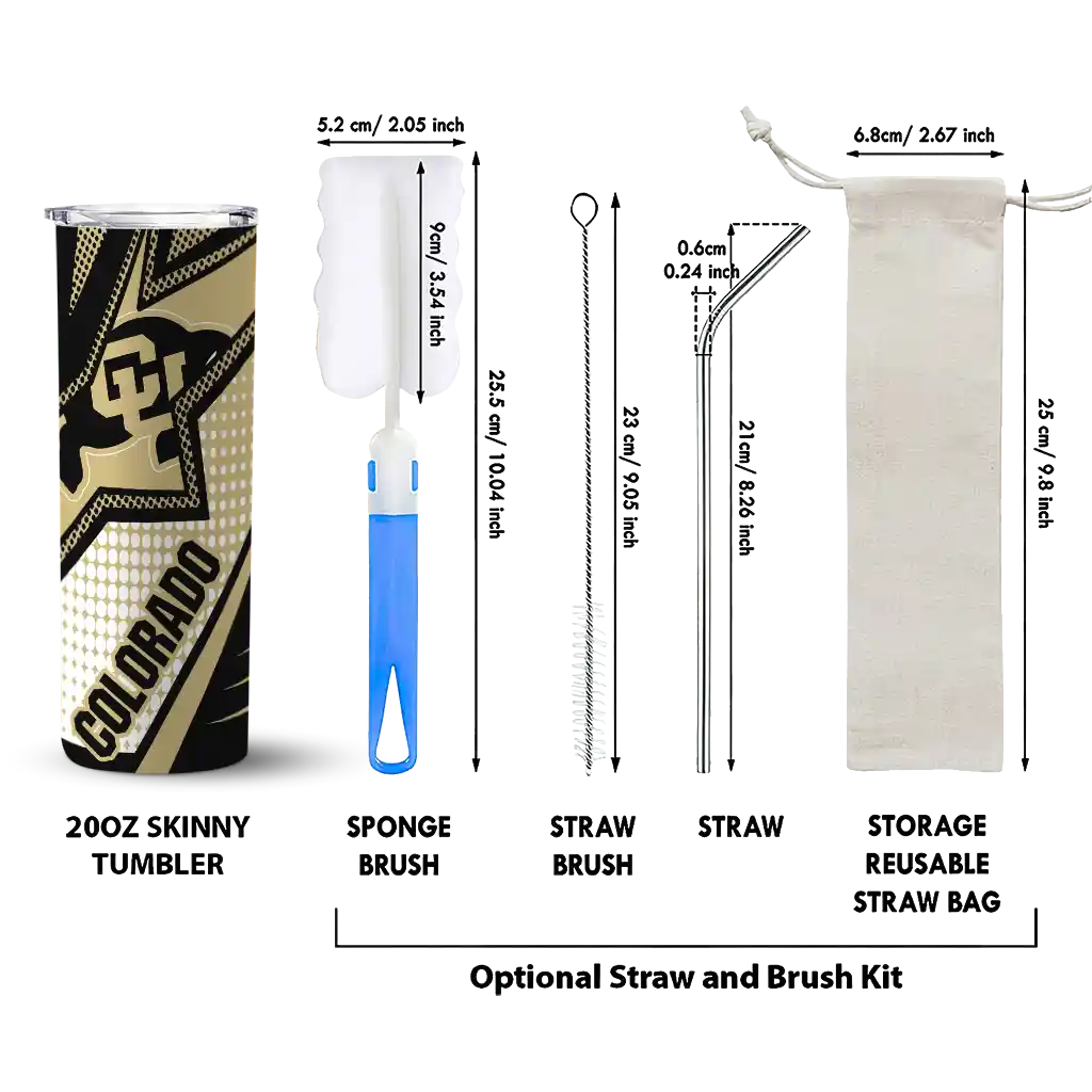 The Customized Colorado Buffaloes Chevron Stripes Gold Skinny Tumbler tumbler is the perfect way to stay refreshed while showing off your pride for Colorado Buffaloes. With its double-wall insulation, your drinks stay at the right temperature for hours, whether you're enjoying a hot coffee or keeping your iced drink cold. What's inside? You’ll find 1 stainless steel tumbler, 1 clear lid, and 1 removable straw. It's the perfect blend of function and fan spirit! Ergonomically designed for comfort, made from durable stainless steel, and insulated to maintain your drink’s temperature, this tumbler is a must-have for any dedicated NCAA fan.
