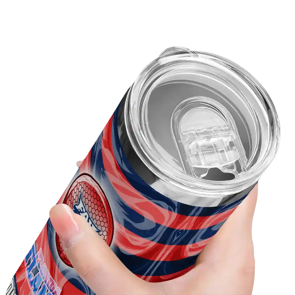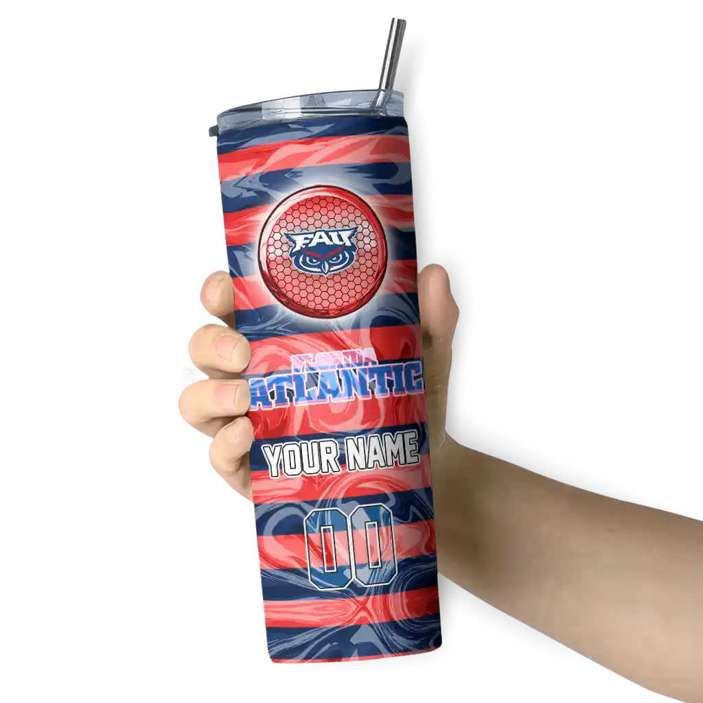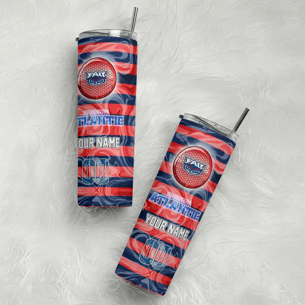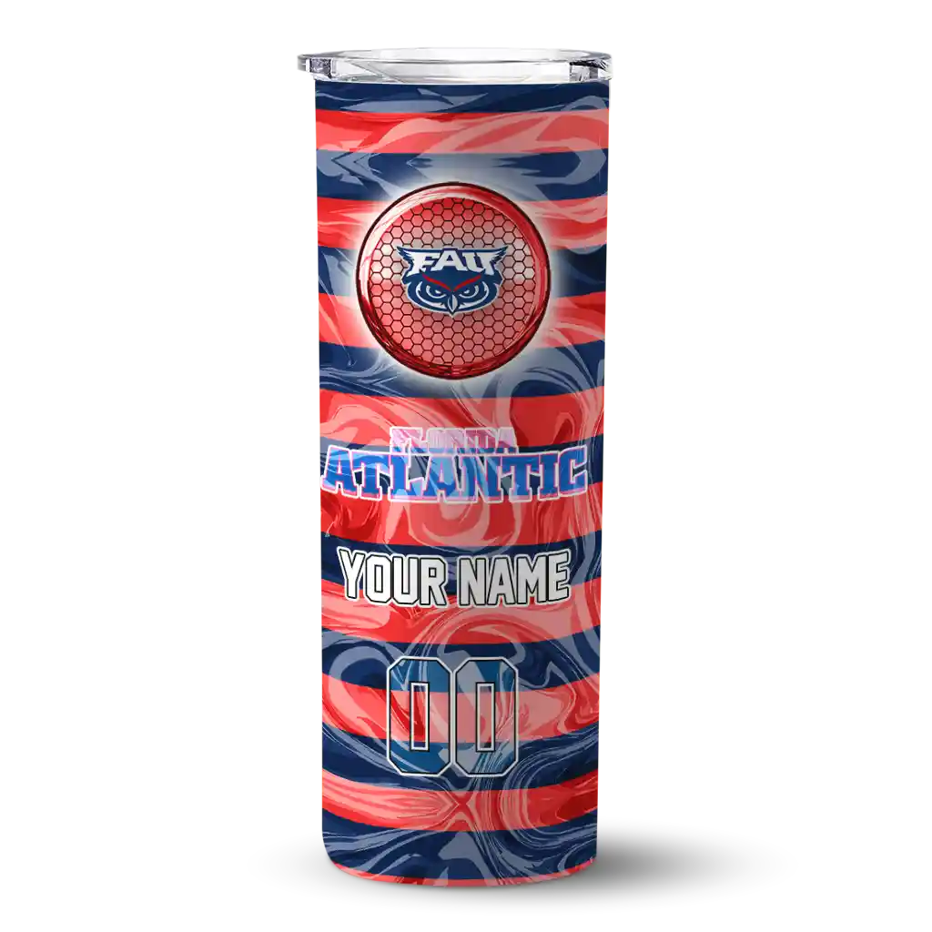 The Customized Florida Atlantic Owls Helmet Belt Blue Black Skinny Tumbler tumbler is the perfect way to stay refreshed while showing off your pride for Florida Atlantic Owls. With its double-wall insulation, your drinks stay at the right temperature for hours, whether you're enjoying a hot coffee or keeping your iced drink cold. What's inside? You’ll find 1 stainless steel tumbler, 1 clear lid, and 1 removable straw. It's the perfect blend of function and fan spirit! Ergonomically designed for comfort, made from durable stainless steel, and insulated to maintain your drink’s temperature, this tumbler is a must-have for any dedicated NCAA fan.