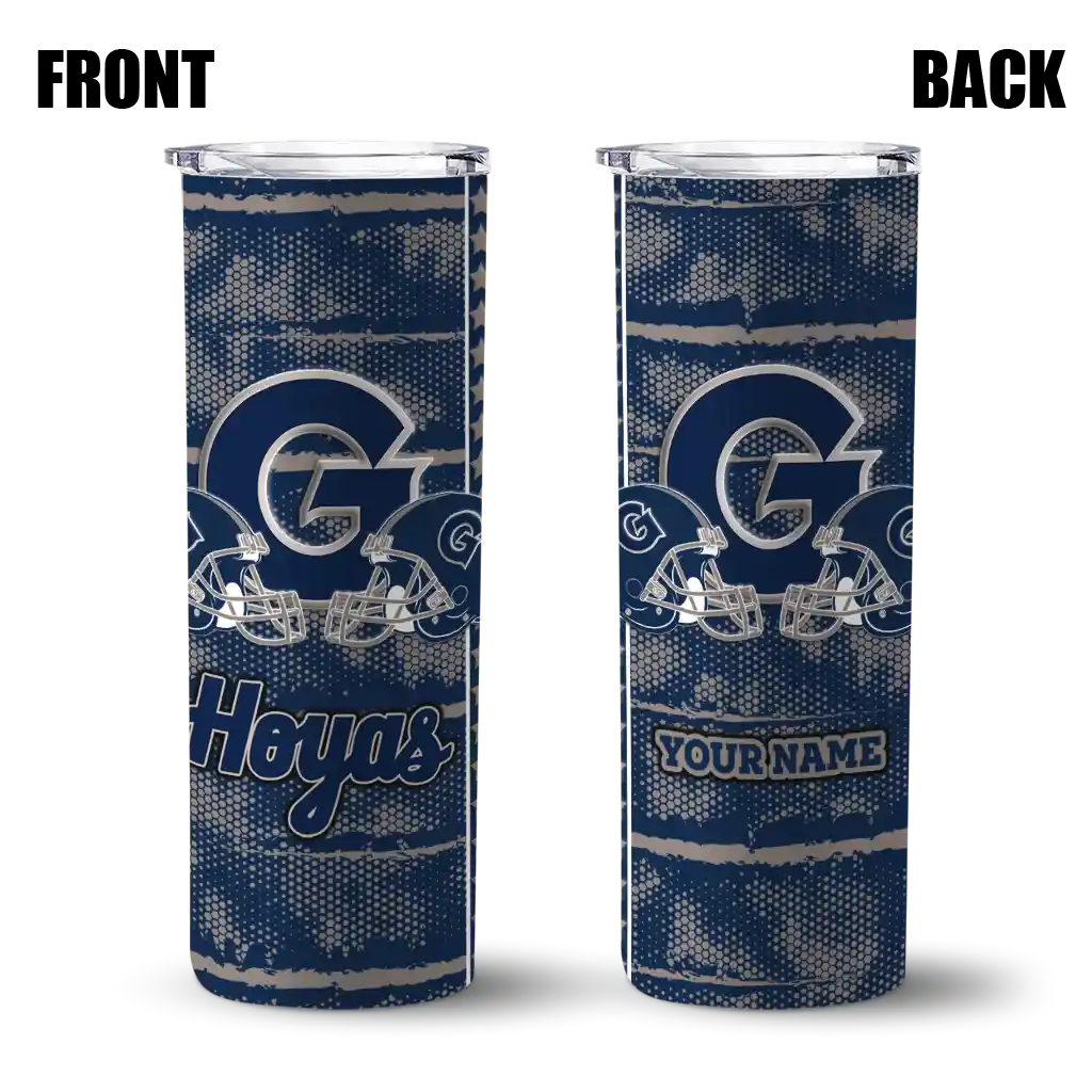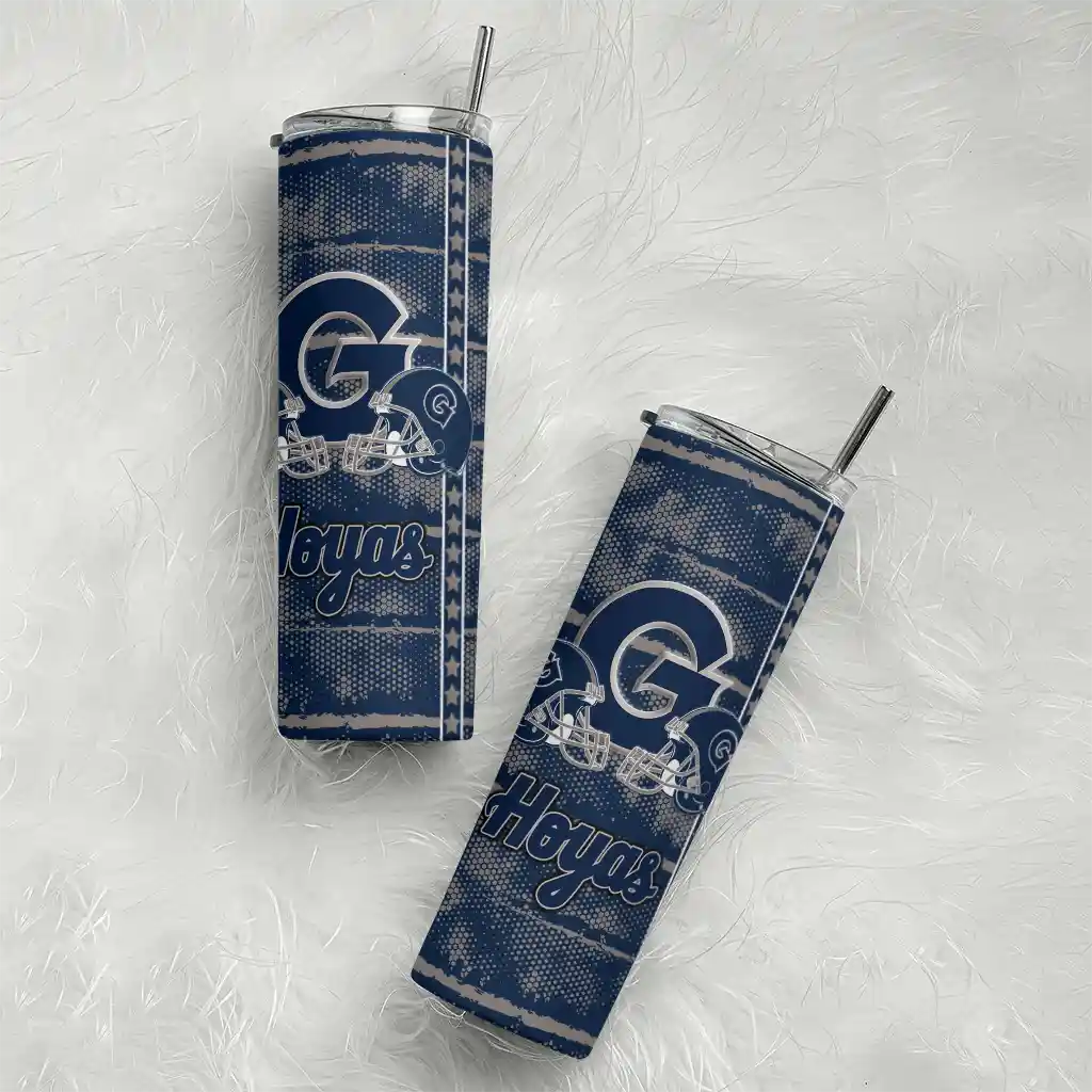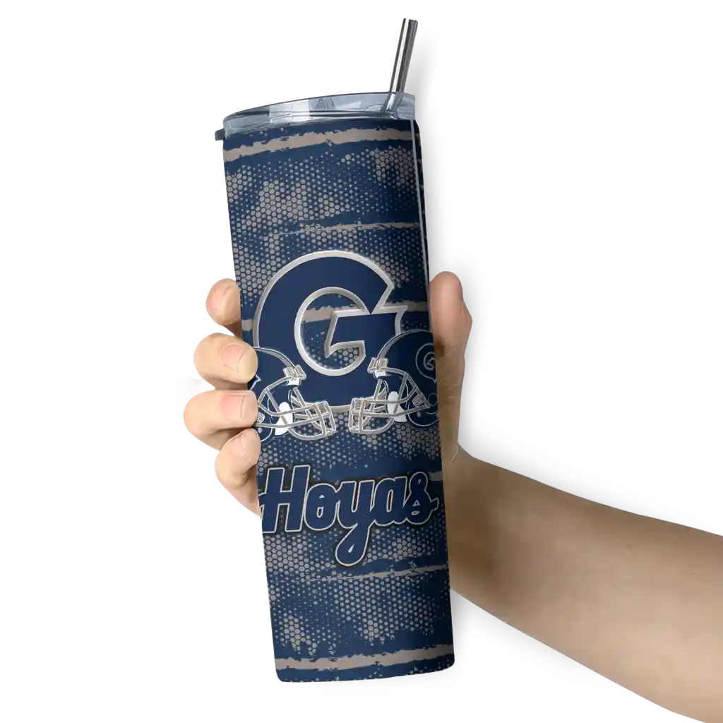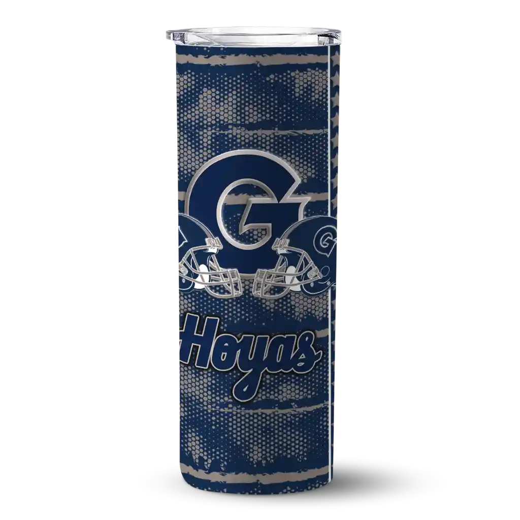 The Custom Georgetown Hoyas Chevron Patch Blue Skinny Tumbler tumbler is the perfect way to stay refreshed while showing off your pride for Georgetown Hoyas. With its double-wall insulation, your drinks stay at the right temperature for hours, whether you're enjoying a hot coffee or keeping your iced drink cold. What's inside? You’ll find 1 stainless steel tumbler, 1 clear lid, and 1 removable straw. It's the perfect blend of function and fan spirit! Ergonomically designed for comfort, made from durable stainless steel, and insulated to maintain your drink’s temperature, this tumbler is a must-have for any dedicated NCAA fan.