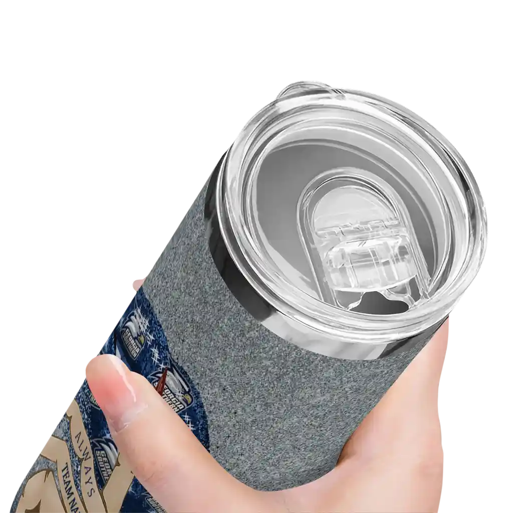 The Customized Georgia Southern Eagles Chevron Stripes Blue Skinny Tumbler tumbler is the perfect way to stay refreshed while showing off your pride for Georgia Southern Eagles. With its double-wall insulation, your drinks stay at the right temperature for hours, whether you're enjoying a hot coffee or keeping your iced drink cold. What's inside? You’ll find 1 stainless steel tumbler, 1 clear lid, and 1 removable straw. It's the perfect blend of function and fan spirit! Ergonomically designed for comfort, made from durable stainless steel, and insulated to maintain your drink’s temperature, this tumbler is a must-have for any dedicated NCAA fan.