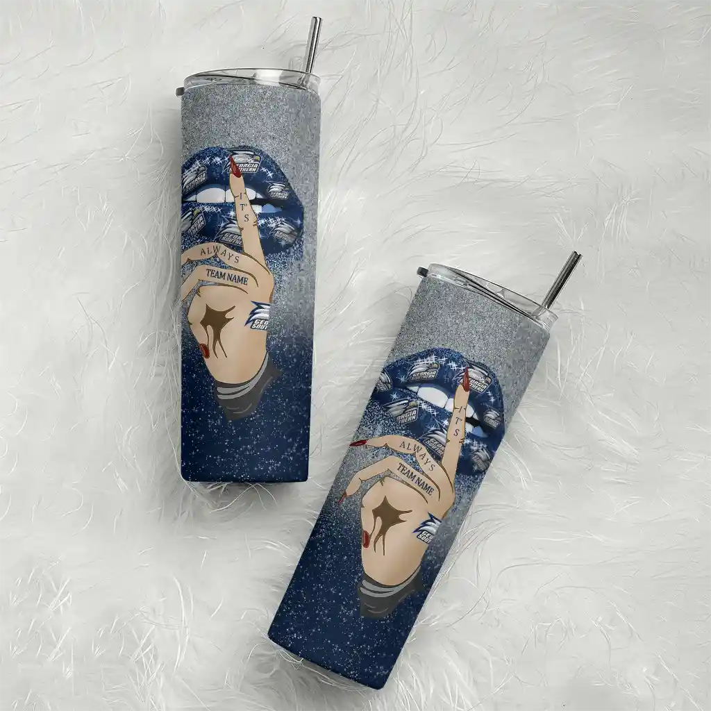 The Custom Georgia Southern Eagles Sparkle Lips Blue Skinny Tumbler tumbler is the perfect way to stay refreshed while showing off your pride for Georgia Southern Eagles. With its double-wall insulation, your drinks stay at the right temperature for hours, whether you're enjoying a hot coffee or keeping your iced drink cold. What's inside? You’ll find 1 stainless steel tumbler, 1 clear lid, and 1 removable straw. It's the perfect blend of function and fan spirit! Ergonomically designed for comfort, made from durable stainless steel, and insulated to maintain your drink’s temperature, this tumbler is a must-have for any dedicated NCAA fan.