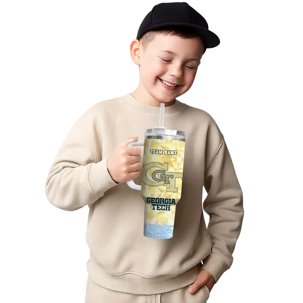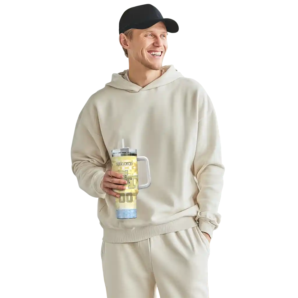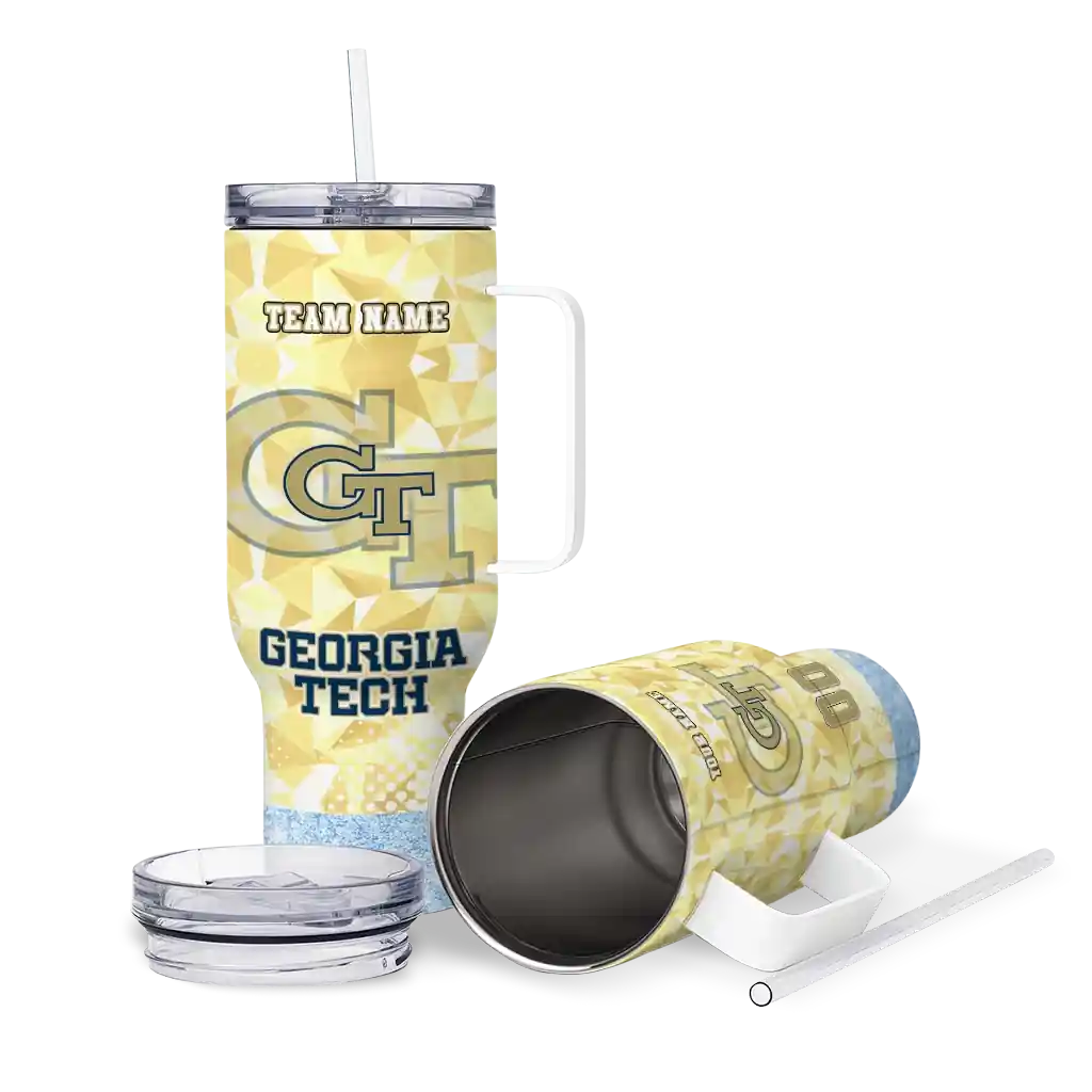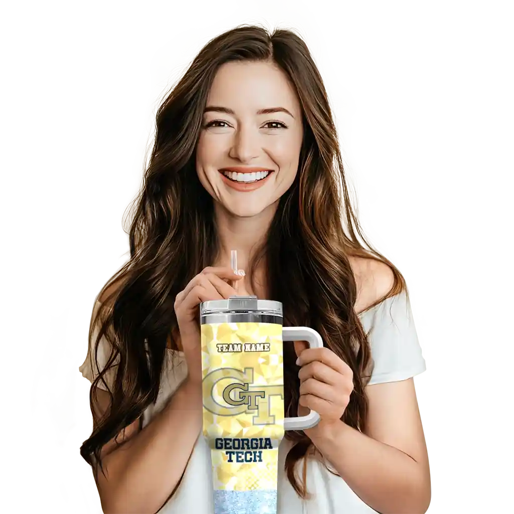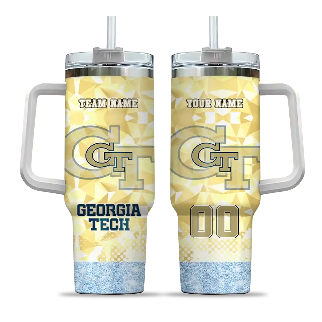 The Georgia Tech Yellow Jackets Curved Tumbler – Custom Geometric Prism Gold is a double-wall insulated stainless steel tumbler designed to maintain your beverage’s ideal temperature. It features an ergonomic curved design for an easy grip and a tough stainless steel build. The item includes the tumbler, a clear lid, and a removable straw. It is easy to clean and low-maintenance. You can personalize this tumbler by adding both a custom name and number of your choice during the ordering process.