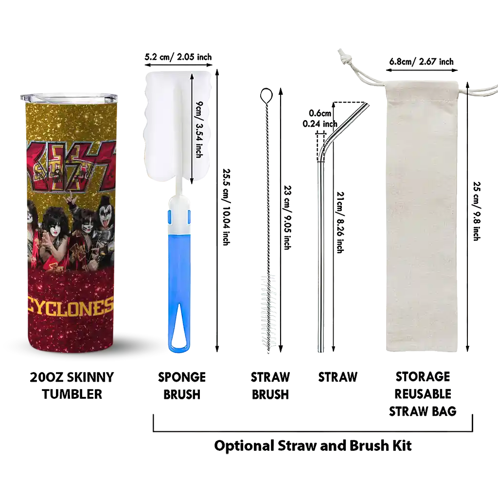The Custom Iowa State Cyclones Kiss Band Gold Skinny Tumbler tumbler is the perfect way to stay refreshed while showing off your pride for Iowa State Cyclones. With its double-wall insulation, your drinks stay at the right temperature for hours, whether you're enjoying a hot coffee or keeping your iced drink cold. What's inside? You’ll find 1 stainless steel tumbler, 1 clear lid, and 1 removable straw. It's the perfect blend of function and fan spirit! Ergonomically designed for comfort, made from durable stainless steel, and insulated to maintain your drink’s temperature, this tumbler is a must-have for any dedicated NCAA fan.