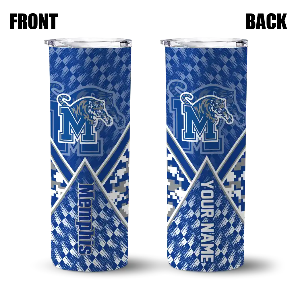 The Custom Memphis Tigers Monogram Burst Blue White Skinny Tumbler tumbler is the perfect way to stay refreshed while showing off your pride for Memphis Tigers. With its double-wall insulation, your drinks stay at the right temperature for hours, whether you're enjoying a hot coffee or keeping your iced drink cold. What's inside? You’ll find 1 stainless steel tumbler, 1 clear lid, and 1 removable straw. It's the perfect blend of function and fan spirit! Ergonomically designed for comfort, made from durable stainless steel, and insulated to maintain your drink’s temperature, this tumbler is a must-have for any dedicated NCAA fan.