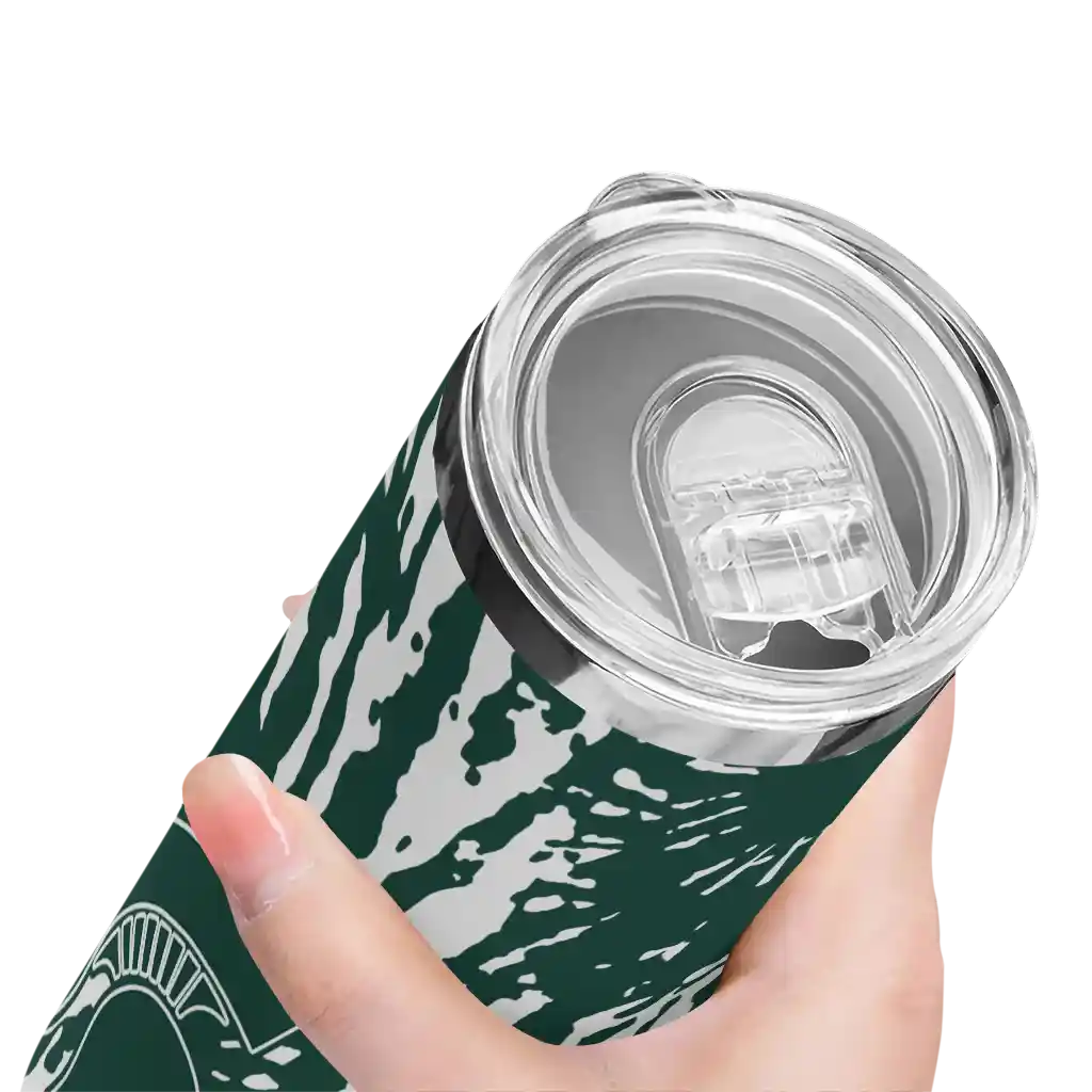 The Personalized Michigan State Spartans Camo Streak Green Skinny Tumbler tumbler is the perfect way to stay refreshed while showing off your pride for Michigan State Spartans. With its double-wall insulation, your drinks stay at the right temperature for hours, whether you're enjoying a hot coffee or keeping your iced drink cold. What's inside? You’ll find 1 stainless steel tumbler, 1 clear lid, and 1 removable straw. It's the perfect blend of function and fan spirit! Ergonomically designed for comfort, made from durable stainless steel, and insulated to maintain your drink’s temperature, this tumbler is a must-have for any dedicated NCAA fan.