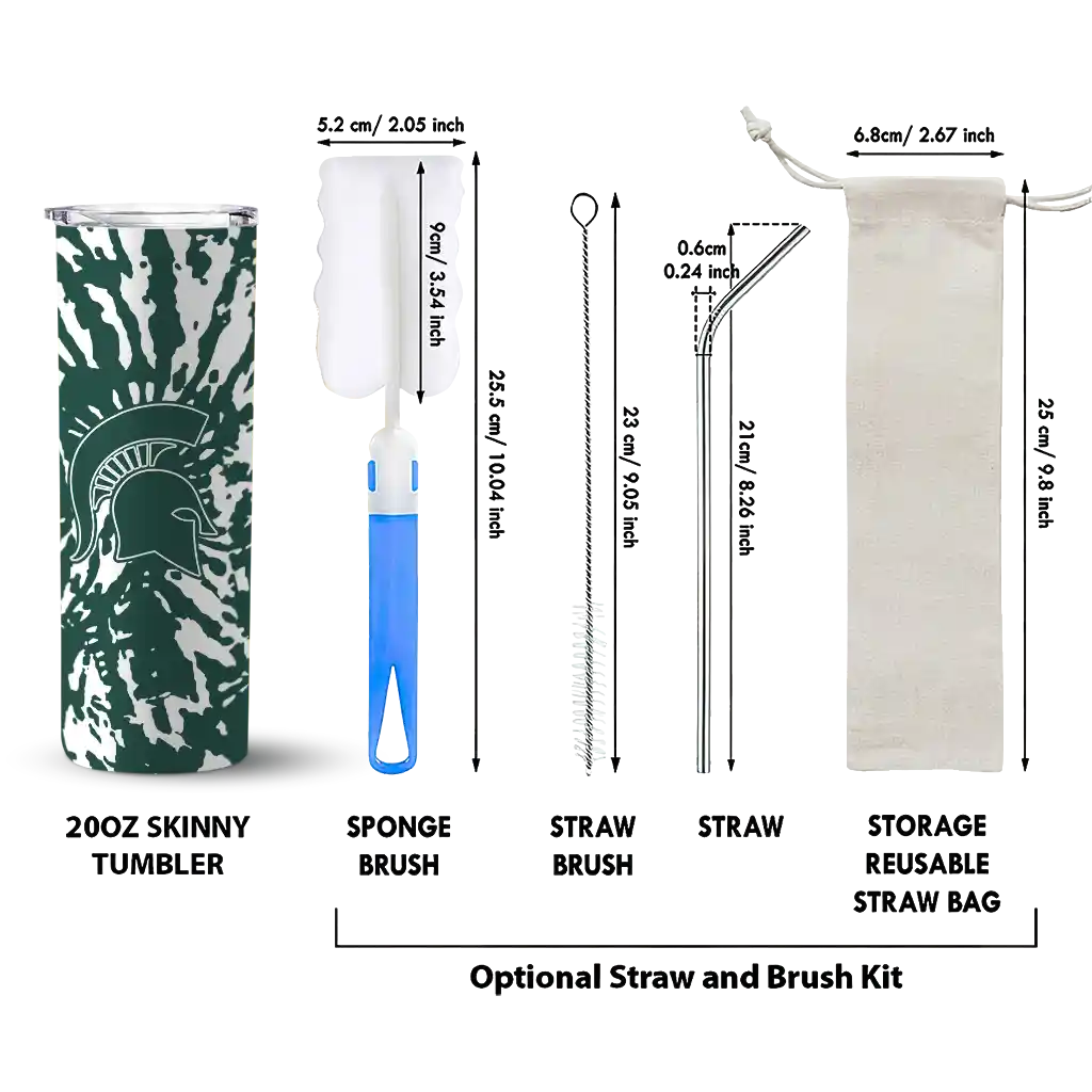 The Custom Michigan State Spartans Metallic Grid Green Skinny Tumbler tumbler is the perfect way to stay refreshed while showing off your pride for Michigan State Spartans. With its double-wall insulation, your drinks stay at the right temperature for hours, whether you're enjoying a hot coffee or keeping your iced drink cold. What's inside? You’ll find 1 stainless steel tumbler, 1 clear lid, and 1 removable straw. It's the perfect blend of function and fan spirit! Ergonomically designed for comfort, made from durable stainless steel, and insulated to maintain your drink’s temperature, this tumbler is a must-have for any dedicated NCAA fan.