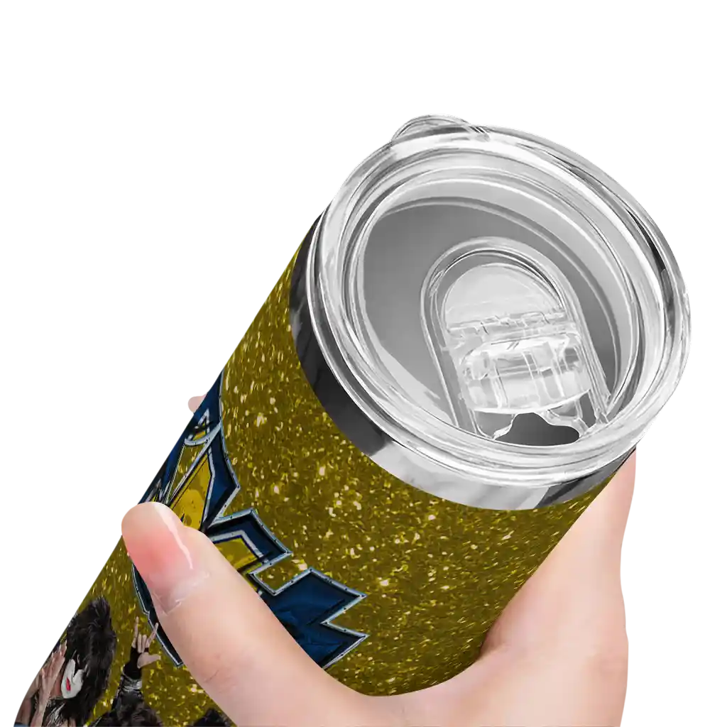The Custom Michigan Wolverines Kiss Band Maize Skinny Tumbler tumbler is the perfect way to stay refreshed while showing off your pride for Michigan Wolverines. With its double-wall insulation, your drinks stay at the right temperature for hours, whether you're enjoying a hot coffee or keeping your iced drink cold. What's inside? You’ll find 1 stainless steel tumbler, 1 clear lid, and 1 removable straw. It's the perfect blend of function and fan spirit! Ergonomically designed for comfort, made from durable stainless steel, and insulated to maintain your drink’s temperature, this tumbler is a must-have for any dedicated NCAA fan.
