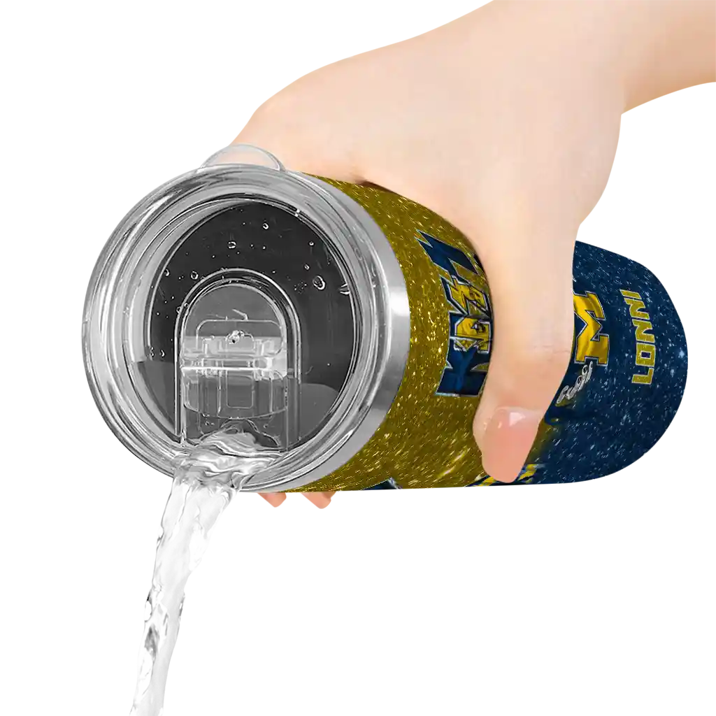 The Michigan Wolverines Radiant Glitter Blue Skinny Tumbler tumbler is the perfect way to stay refreshed while showing off your pride for Michigan Wolverines. With its double-wall insulation, your drinks stay at the right temperature for hours, whether you're enjoying a hot coffee or keeping your iced drink cold. What's inside? You’ll find 1 stainless steel tumbler, 1 clear lid, and 1 removable straw. It's the perfect blend of function and fan spirit! Ergonomically designed for comfort, made from durable stainless steel, and insulated to maintain your drink’s temperature, this tumbler is a must-have for any dedicated NCAA fan.