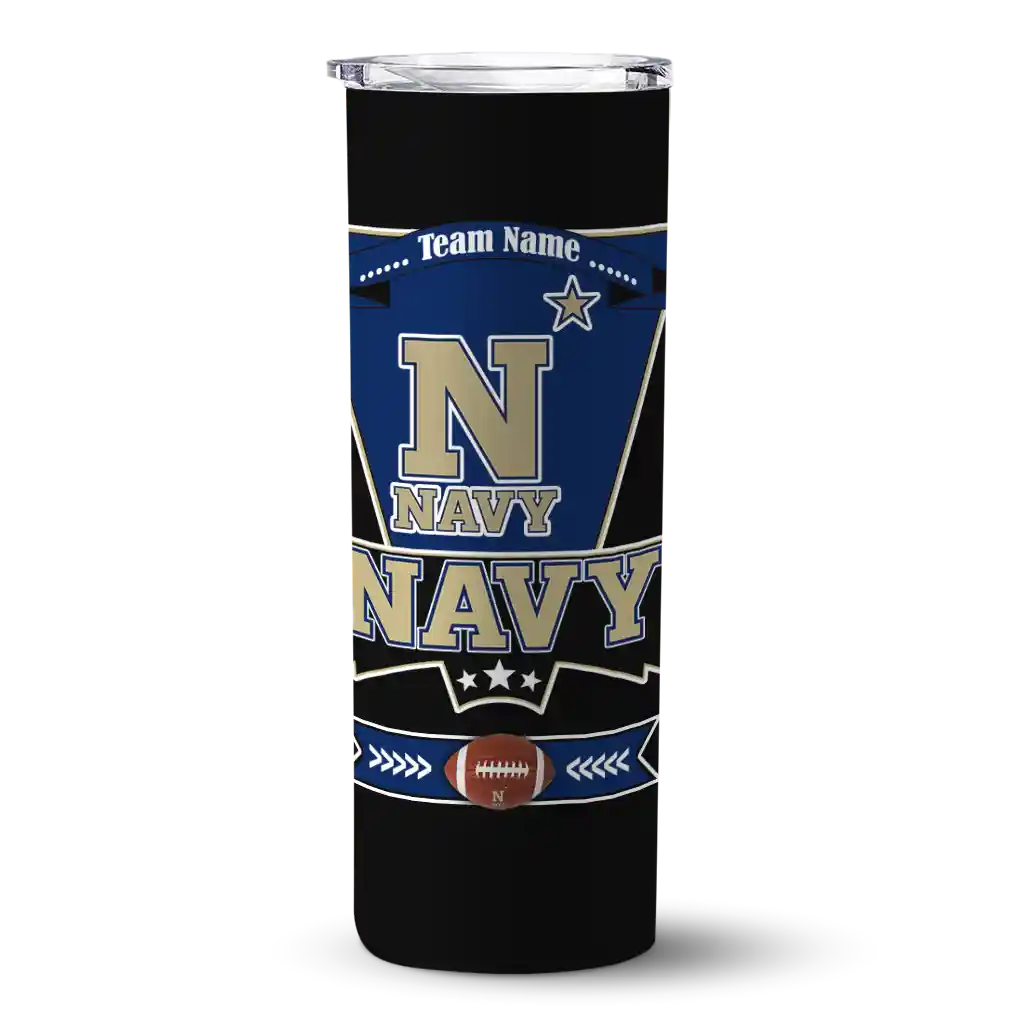 The Custom Navy Midshipmen Helmet Belt Blue Black Skinny Tumbler tumbler is the perfect way to stay refreshed while showing off your pride for Navy Midshipmen. With its double-wall insulation, your drinks stay at the right temperature for hours, whether you're enjoying a hot coffee or keeping your iced drink cold. What's inside? You’ll find 1 stainless steel tumbler, 1 clear lid, and 1 removable straw. It's the perfect blend of function and fan spirit! Ergonomically designed for comfort, made from durable stainless steel, and insulated to maintain your drink’s temperature, this tumbler is a must-have for any dedicated NCAA fan.