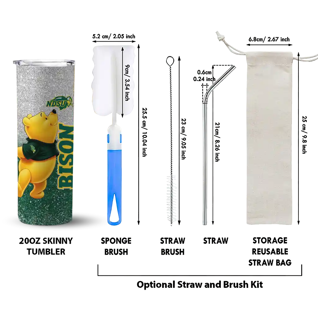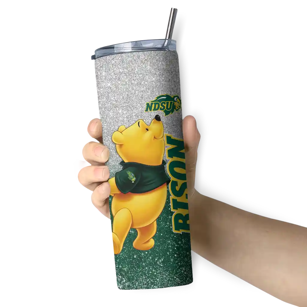The Custom North Dakota State Bison Winnie the Pooh Green Gray Skinny Tumbler tumbler is the perfect way to stay refreshed while showing off your pride for North Dakota State Bison. With its double-wall insulation, your drinks stay at the right temperature for hours, whether you're enjoying a hot coffee or keeping your iced drink cold. What's inside? You’ll find 1 stainless steel tumbler, 1 clear lid, and 1 removable straw. It's the perfect blend of function and fan spirit! Ergonomically designed for comfort, made from durable stainless steel, and insulated to maintain your drink’s temperature, this tumbler is a must-have for any dedicated NCAA fan.