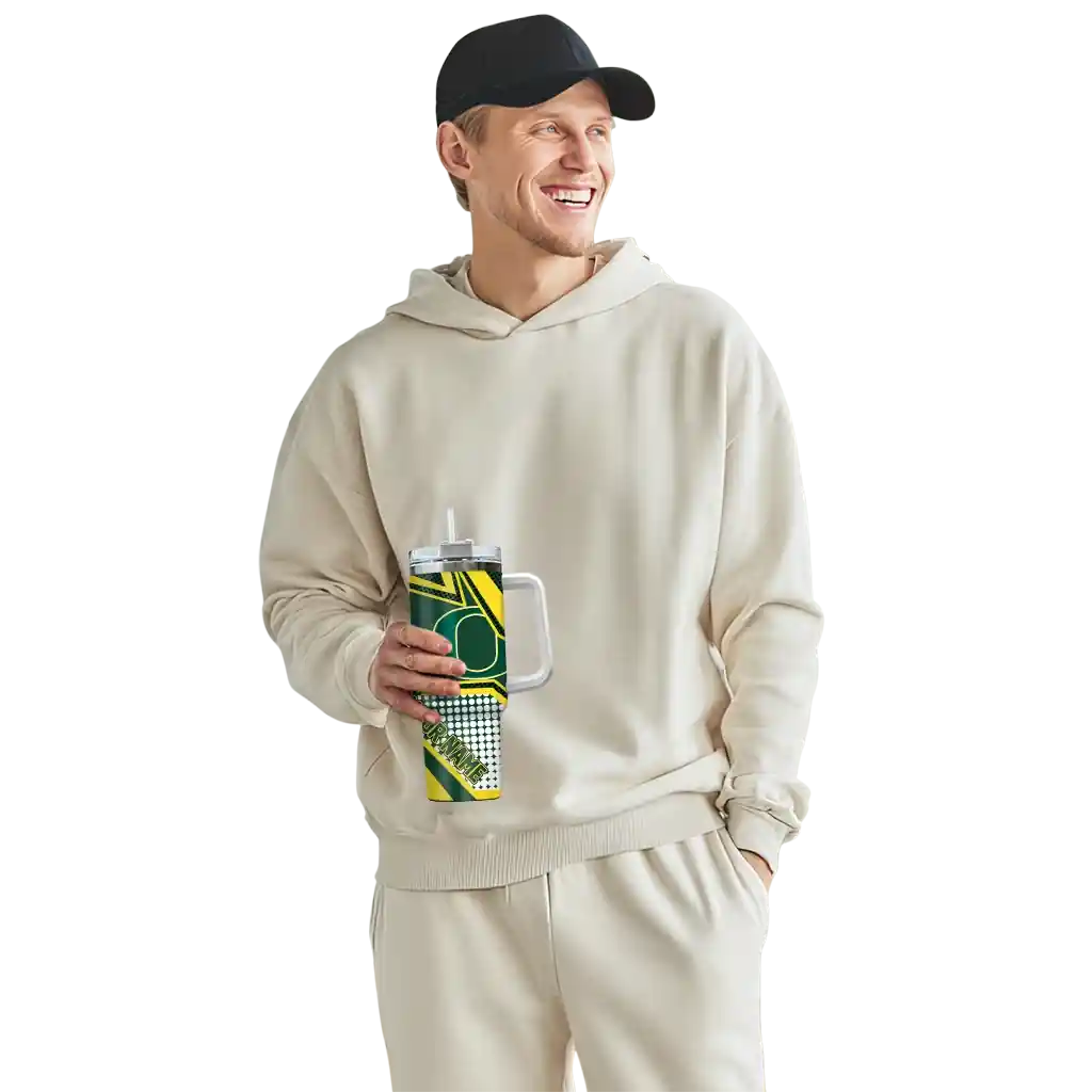 No question about it—the Personalized Oregon Ducks Hexagon Armor Green Curved Tumbler is the ultimate way to stay refreshed while rocking your Oregon Ducks pride. From the stadium to your tailgate, or just chilling at home, this sleek tumbler makes sure you stay hydrated in style. What’s in the box? A stainless steel tumbler, clear lid, and removable straw—all the essentials for keeping your favorite drinks on point!