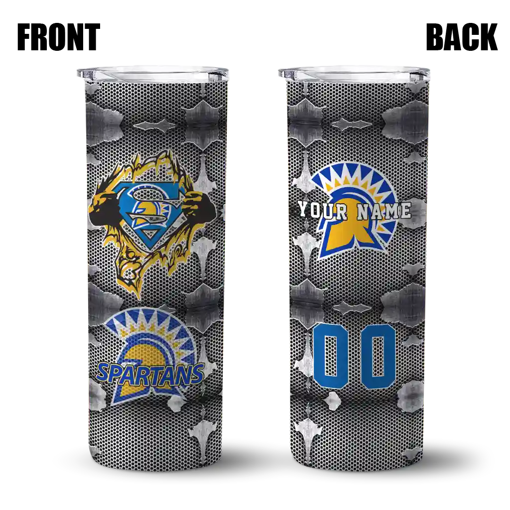 No question about it—the Personalized San Jose State Spartans Heart Helmet Motif Blue Curved Tumbler is the ultimate way to stay refreshed while rocking your San Jose State Spartans pride. From the stadium to your tailgate, or just chilling at home, this sleek tumbler makes sure you stay hydrated in style. What’s in the box? A stainless steel tumbler, clear lid, and removable straw—all the essentials for keeping your favorite drinks on point!