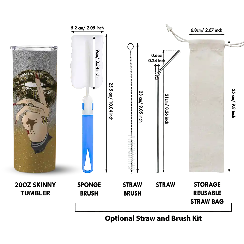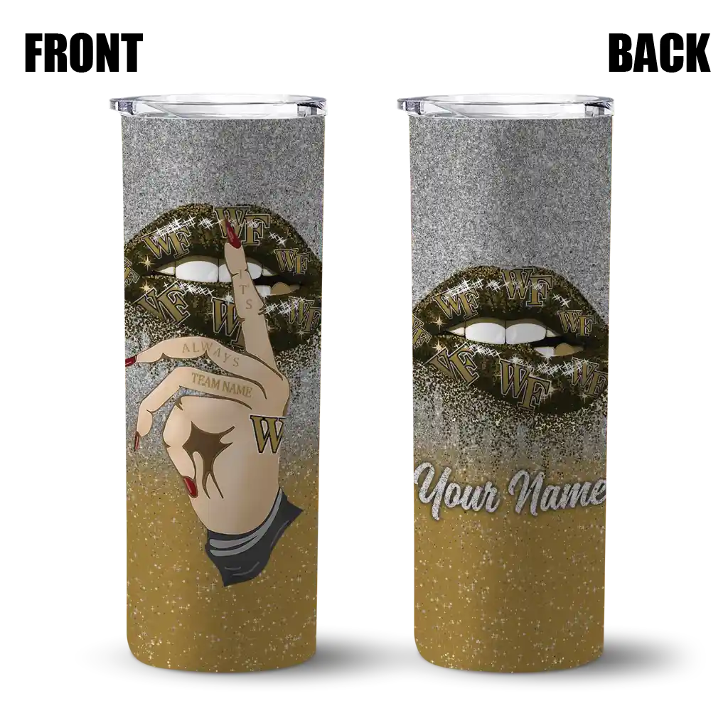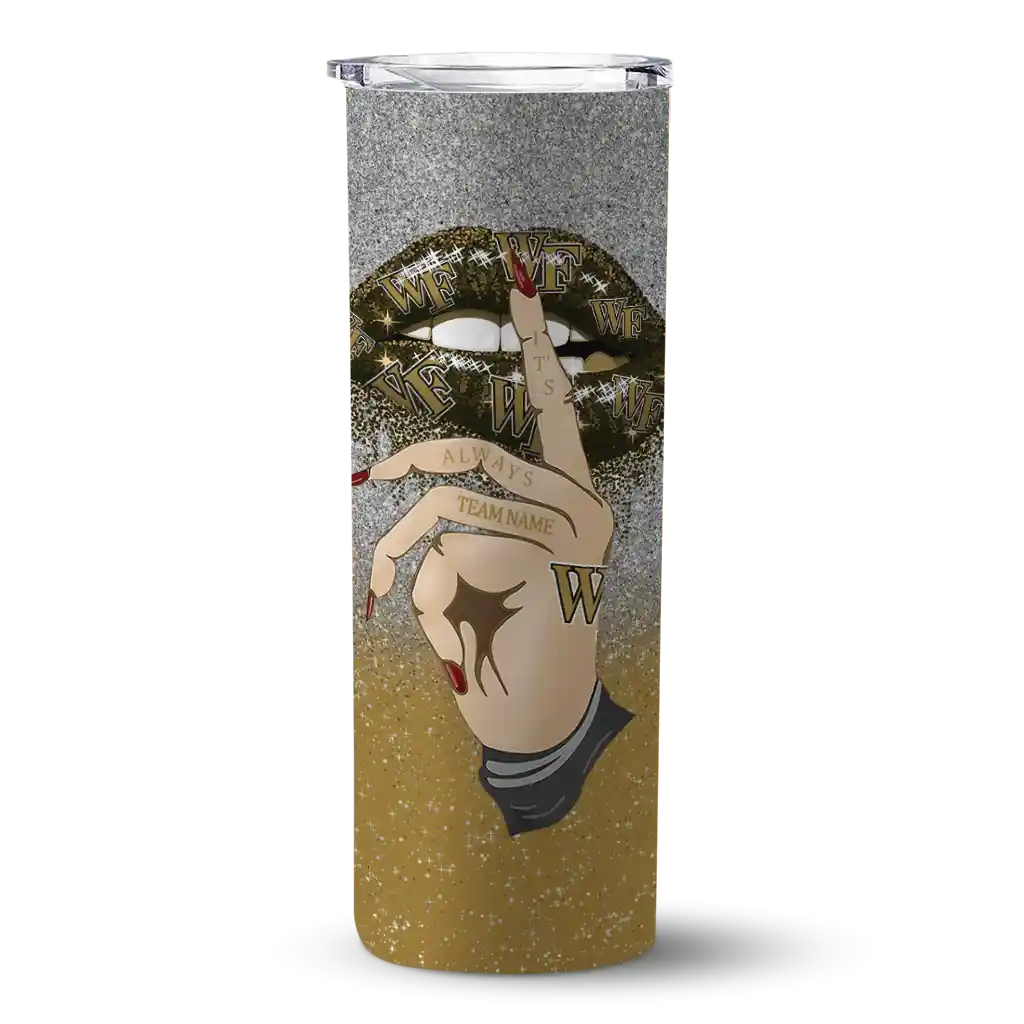 The Custom Wake Forest Demon Deacons Sparkle Lips Gold Skinny Tumbler tumbler is the perfect way to stay refreshed while showing off your pride for Wake Forest Demon Deacons. With its double-wall insulation, your drinks stay at the right temperature for hours, whether you're enjoying a hot coffee or keeping your iced drink cold. What's inside? You’ll find 1 stainless steel tumbler, 1 clear lid, and 1 removable straw. It's the perfect blend of function and fan spirit! Ergonomically designed for comfort, made from durable stainless steel, and insulated to maintain your drink’s temperature, this tumbler is a must-have for any dedicated NCAA fan.