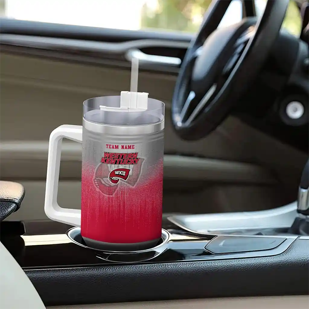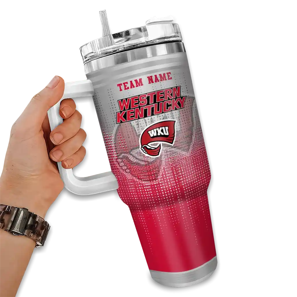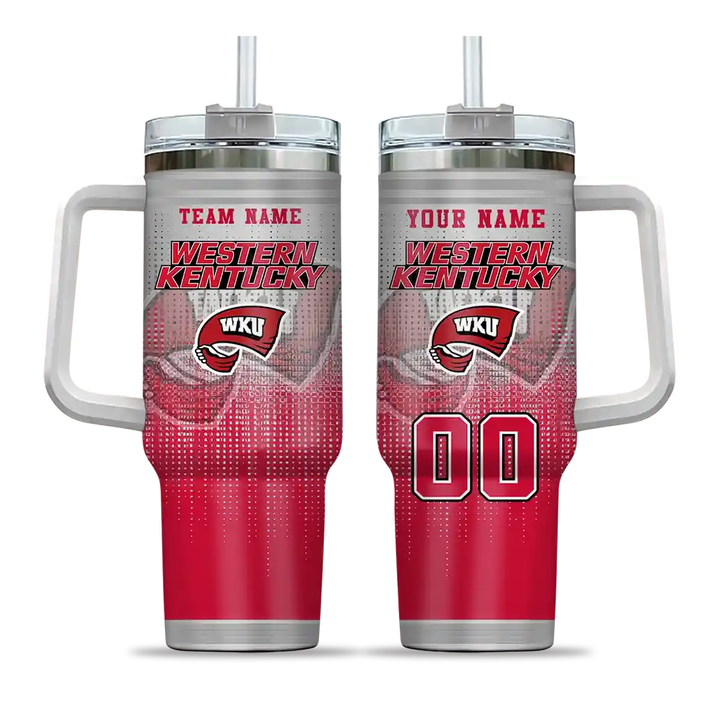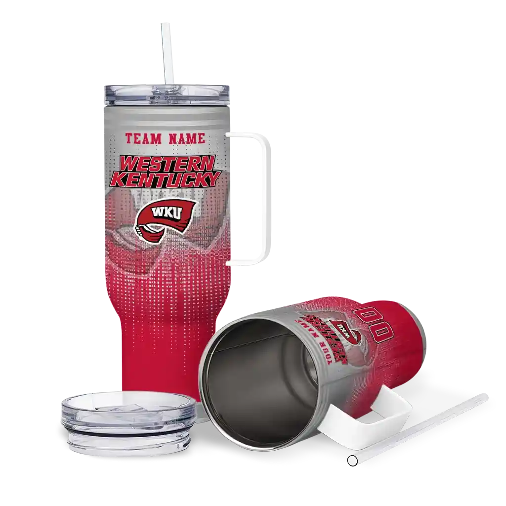 The Western Kentucky Hilltoppers Curved Tumbler – Custom Gradient Dots Red is a double-wall insulated stainless steel tumbler designed to maintain your beverage’s ideal temperature. It features an ergonomic curved design for an easy grip and a tough stainless steel build. The item includes the tumbler, a clear lid, and a removable straw. It is easy to clean and low-maintenance. You can personalize this tumbler by adding both a custom name and number of your choice during the ordering process.