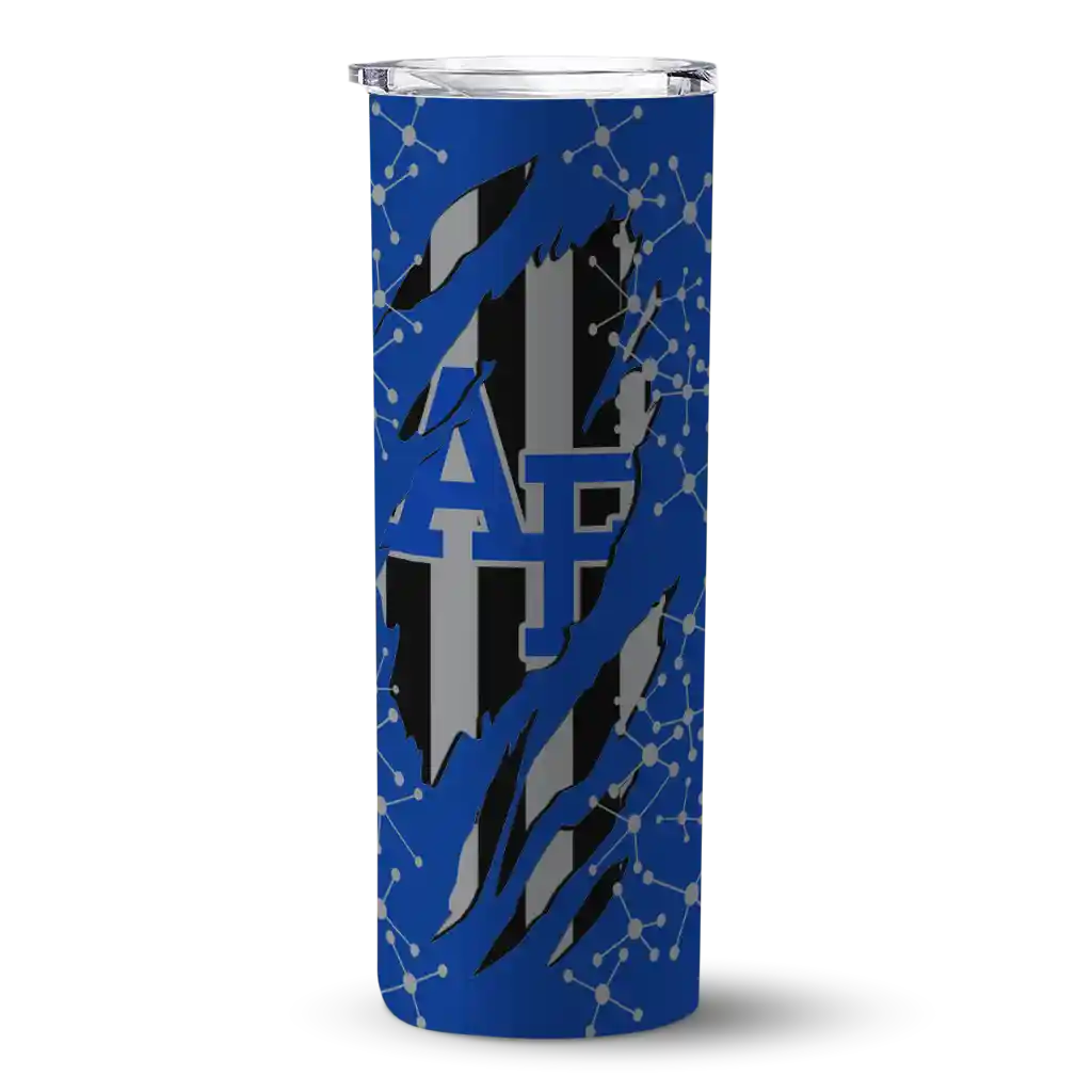 The Customized Air Force Falcons Star Pop Blue Black Skinny Tumbler tumbler is the perfect way to stay refreshed while showing off your pride for Air Force Falcons. With its double-wall insulation, your drinks stay at the right temperature for hours, whether you're enjoying a hot coffee or keeping your iced drink cold. What's inside? You’ll find 1 stainless steel tumbler, 1 clear lid, and 1 removable straw. It's the perfect blend of function and fan spirit! Ergonomically designed for comfort, made from durable stainless steel, and insulated to maintain your drink’s temperature, this tumbler is a must-have for any dedicated NCAA fan.