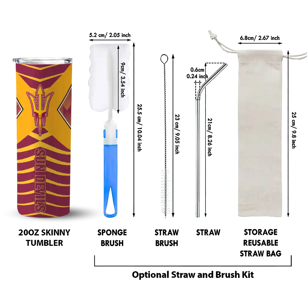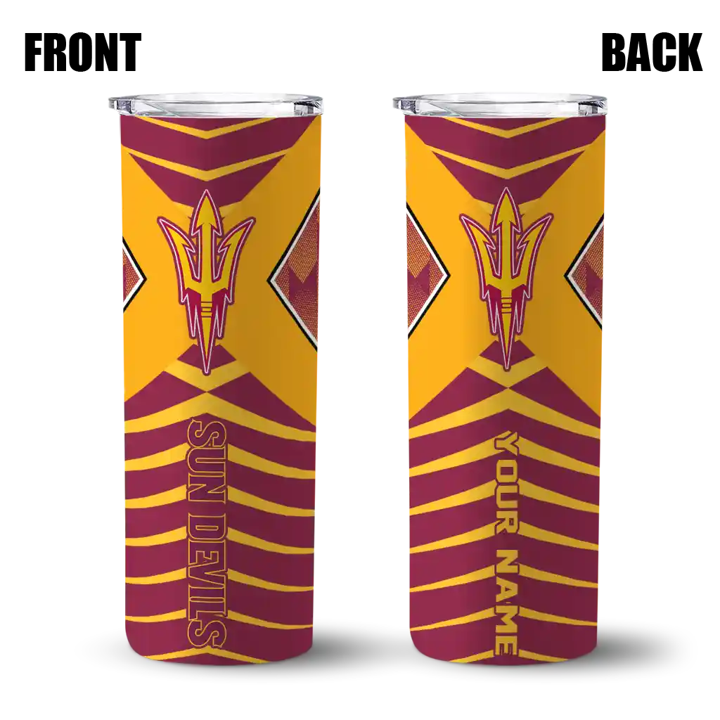 The Customized Arizona State Sun Devils Camo Texture Maroon Skinny Tumbler tumbler is the perfect way to stay refreshed while showing off your pride for Arizona State Sun Devils. With its double-wall insulation, your drinks stay at the right temperature for hours, whether you're enjoying a hot coffee or keeping your iced drink cold. What's inside? You’ll find 1 stainless steel tumbler, 1 clear lid, and 1 removable straw. It's the perfect blend of function and fan spirit! Ergonomically designed for comfort, made from durable stainless steel, and insulated to maintain your drink’s temperature, this tumbler is a must-have for any dedicated NCAA fan.