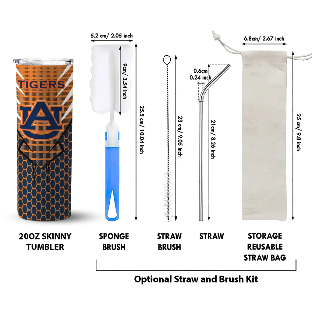 The Customized Auburn Tigers Chevron Stripes Navy Blue Skinny Tumbler tumbler is the perfect way to stay refreshed while showing off your pride for Auburn Tigers. With its double-wall insulation, your drinks stay at the right temperature for hours, whether you're enjoying a hot coffee or keeping your iced drink cold. What's inside? You’ll find 1 stainless steel tumbler, 1 clear lid, and 1 removable straw. It's the perfect blend of function and fan spirit! Ergonomically designed for comfort, made from durable stainless steel, and insulated to maintain your drink’s temperature, this tumbler is a must-have for any dedicated NCAA fan.