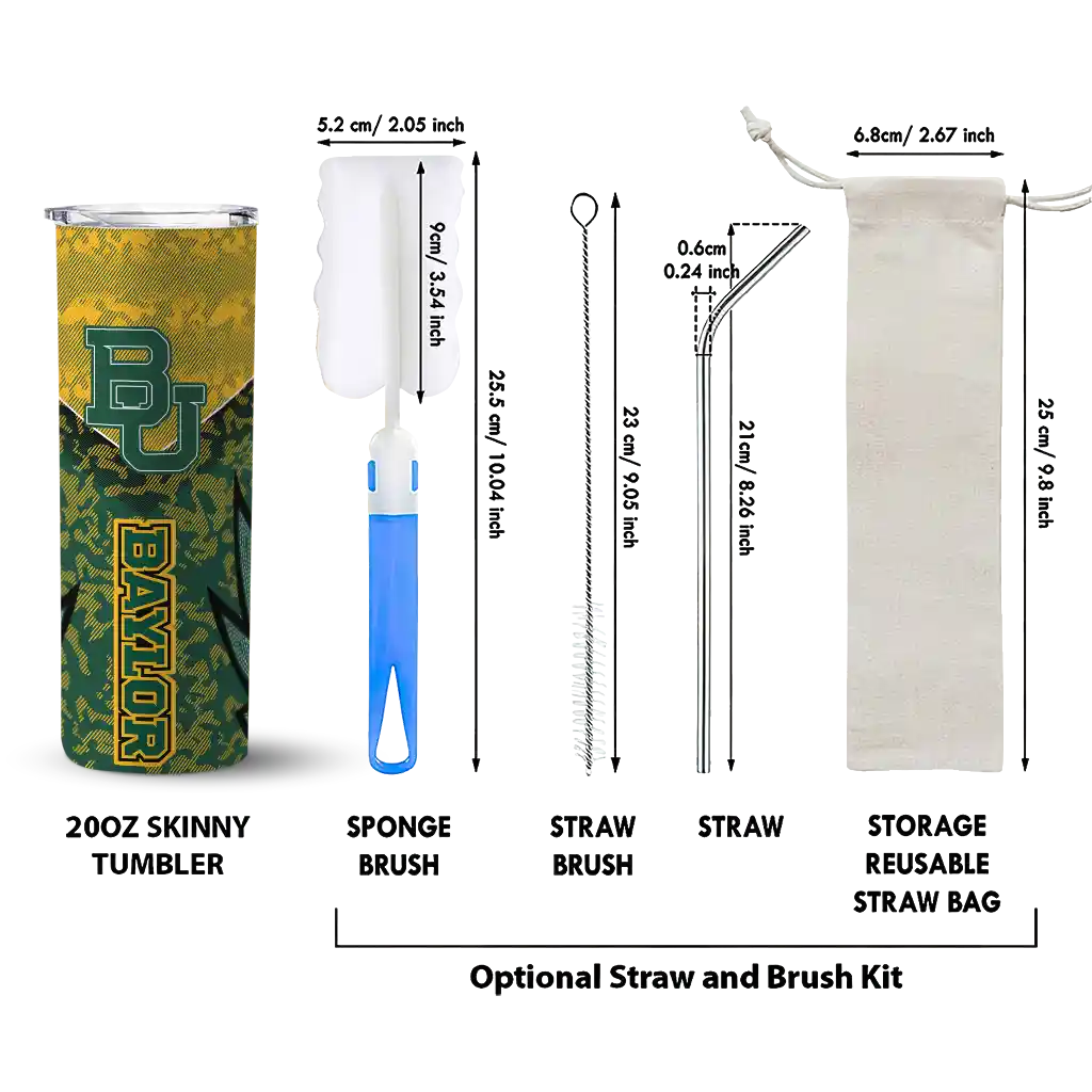 The Custom Baylor Bears Metallic Grid Green Skinny Tumbler tumbler is the perfect way to stay refreshed while showing off your pride for Baylor Bears. With its double-wall insulation, your drinks stay at the right temperature for hours, whether you're enjoying a hot coffee or keeping your iced drink cold. What's inside? You’ll find 1 stainless steel tumbler, 1 clear lid, and 1 removable straw. It's the perfect blend of function and fan spirit! Ergonomically designed for comfort, made from durable stainless steel, and insulated to maintain your drink’s temperature, this tumbler is a must-have for any dedicated NCAA fan.