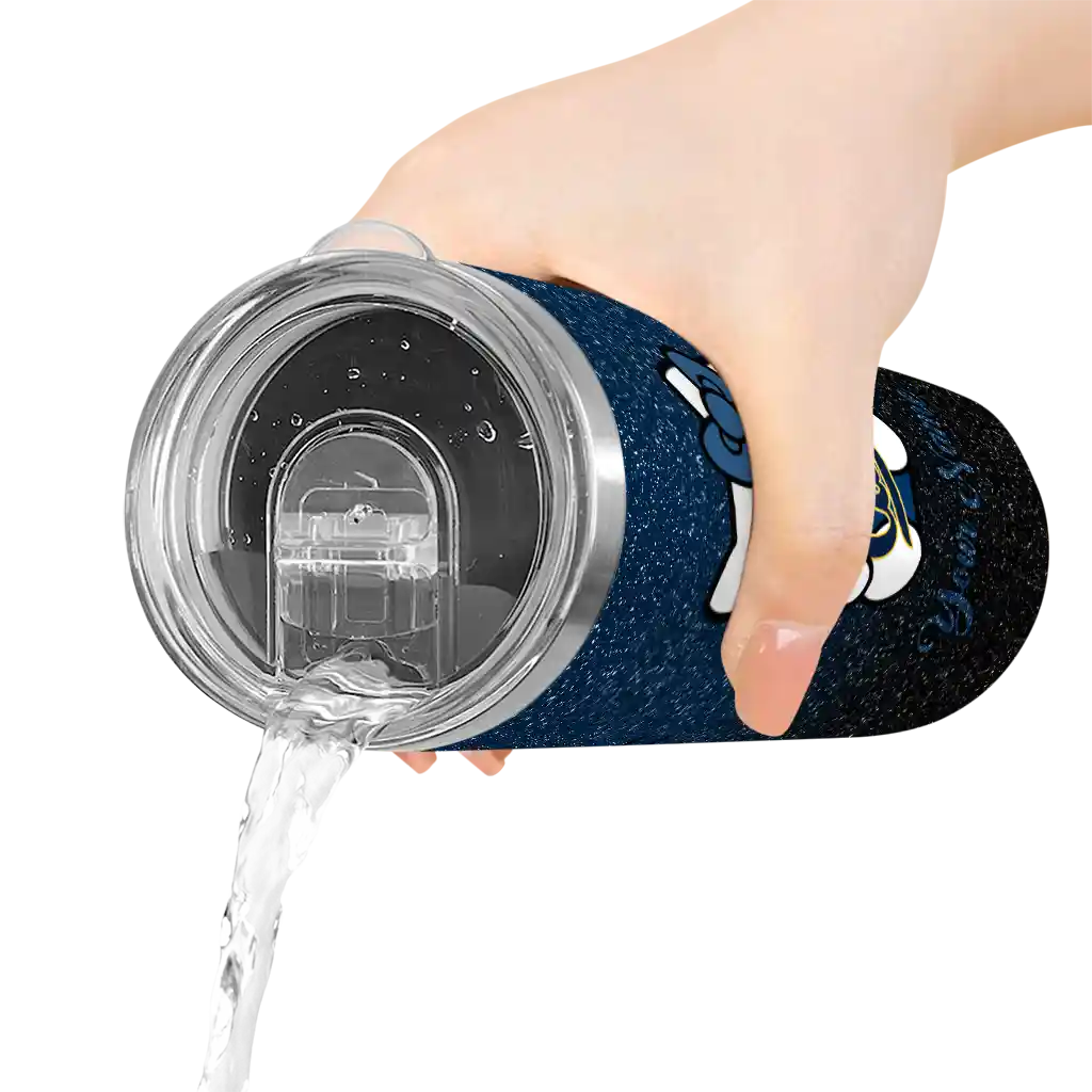 The Customized California Golden Bears Hello Kitty Blue Black Skinny Tumbler tumbler is the perfect way to stay refreshed while showing off your pride for California Golden Bears. With its double-wall insulation, your drinks stay at the right temperature for hours, whether you're enjoying a hot coffee or keeping your iced drink cold. What's inside? You’ll find 1 stainless steel tumbler, 1 clear lid, and 1 removable straw. It's the perfect blend of function and fan spirit! Ergonomically designed for comfort, made from durable stainless steel, and insulated to maintain your drink’s temperature, this tumbler is a must-have for any dedicated NCAA fan.