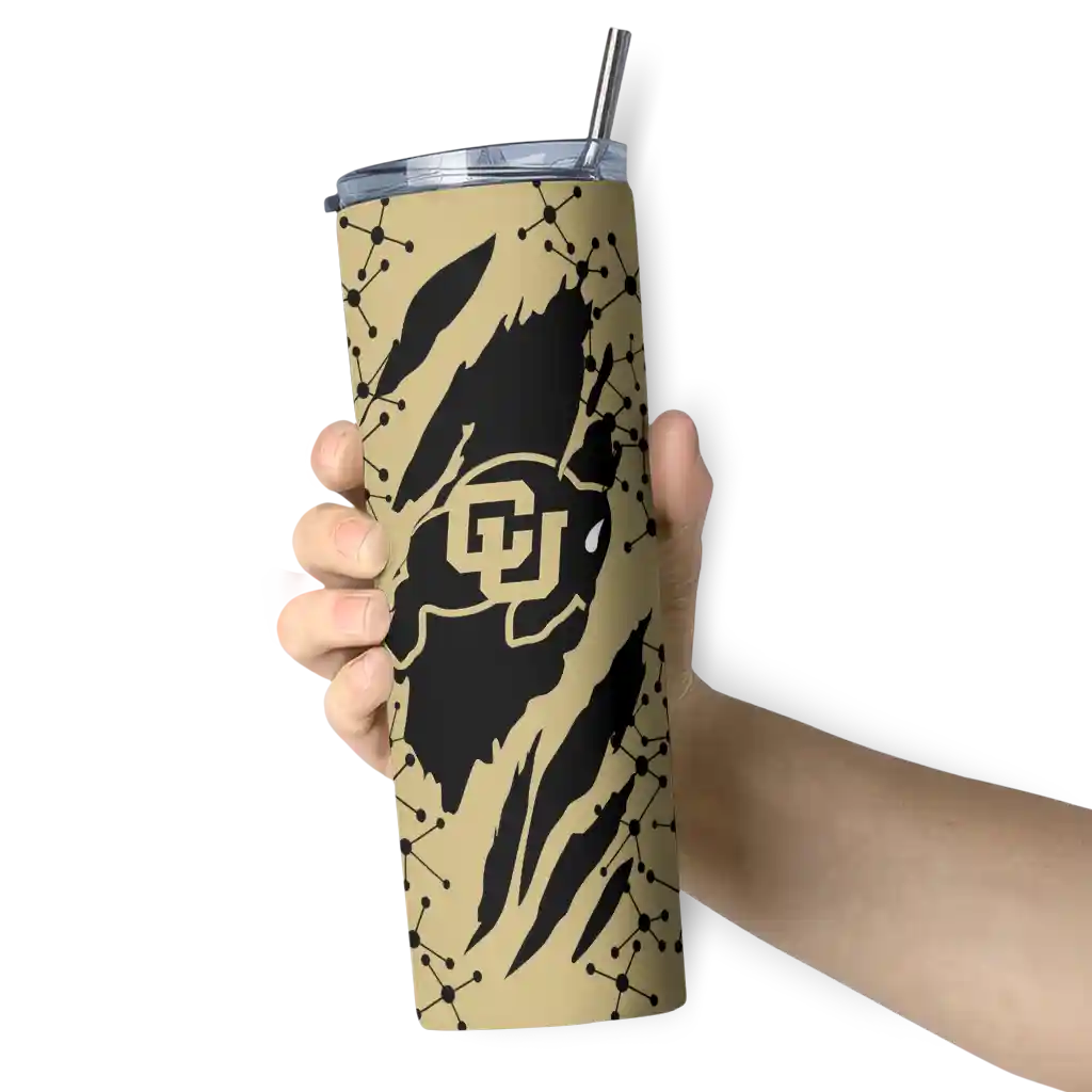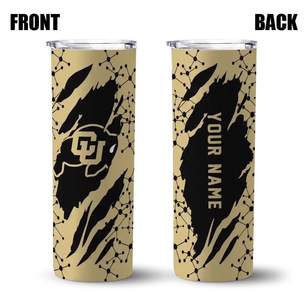 No question about it—the Custom Colorado Buffaloes Claw Cut Gold Black Curved Tumbler is the ultimate way to stay refreshed while rocking your Colorado Buffaloes pride. From the stadium to your tailgate, or just chilling at home, this sleek tumbler makes sure you stay hydrated in style. What’s in the box? A stainless steel tumbler, clear lid, and removable straw—all the essentials for keeping your favorite drinks on point!