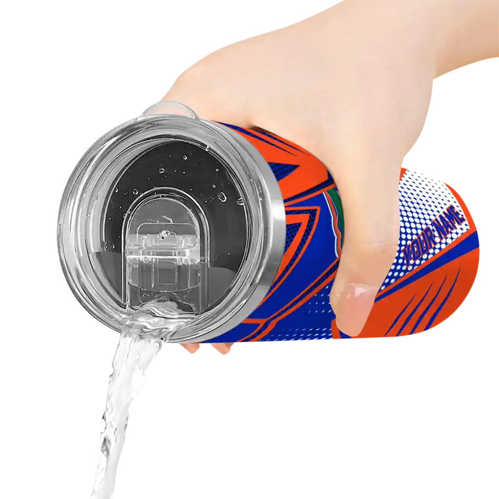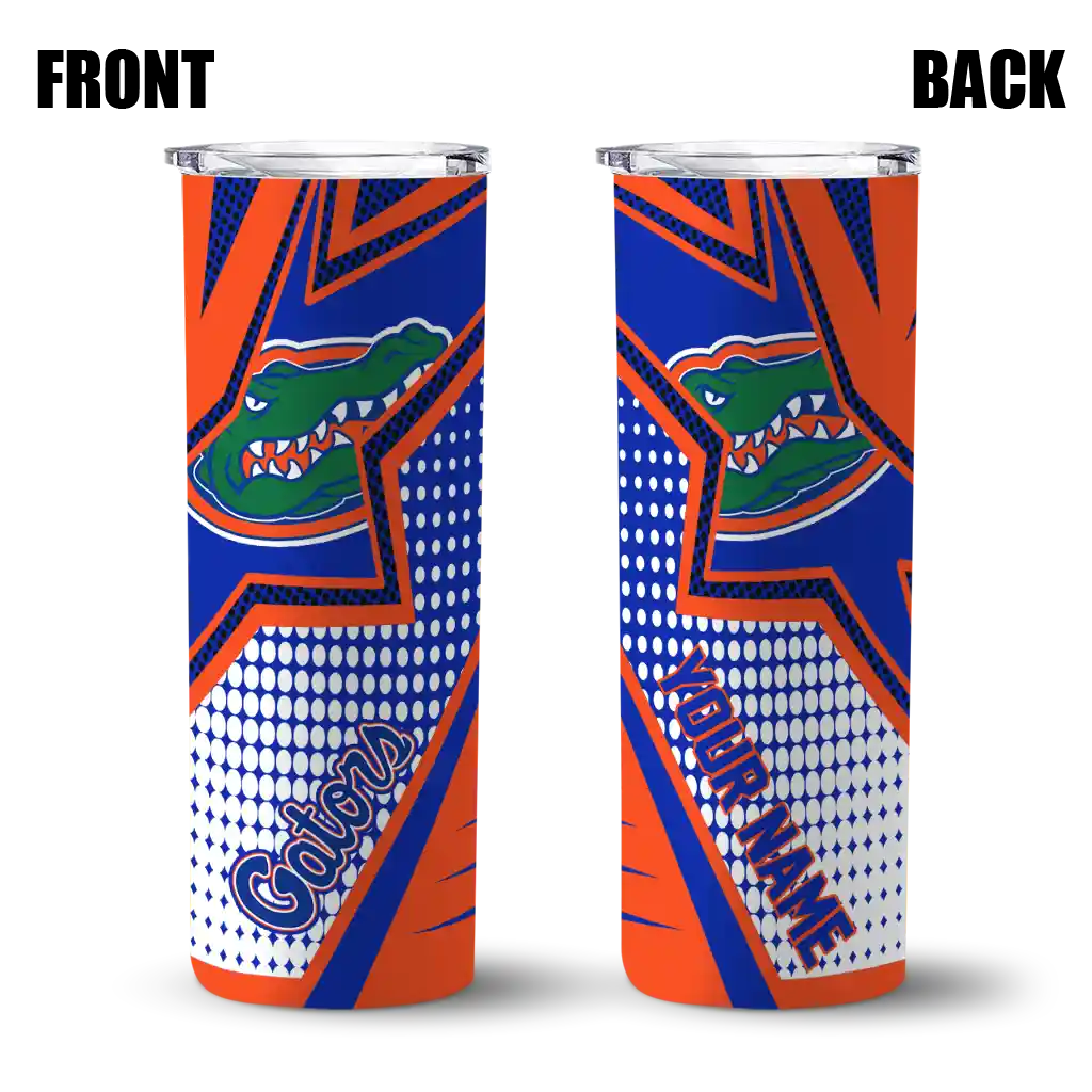 The Personalized Florida Gators Star Pop Blue Black Skinny Tumbler tumbler is the perfect way to stay refreshed while showing off your pride for Florida Gators. With its double-wall insulation, your drinks stay at the right temperature for hours, whether you're enjoying a hot coffee or keeping your iced drink cold. What's inside? You’ll find 1 stainless steel tumbler, 1 clear lid, and 1 removable straw. It's the perfect blend of function and fan spirit! Ergonomically designed for comfort, made from durable stainless steel, and insulated to maintain your drink’s temperature, this tumbler is a must-have for any dedicated NCAA fan.