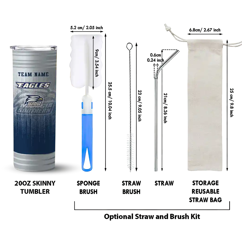 The Custom Georgia Southern Eagles Star Cluster Blue Skinny Tumbler tumbler is the perfect way to stay refreshed while showing off your pride for Georgia Southern Eagles. With its double-wall insulation, your drinks stay at the right temperature for hours, whether you're enjoying a hot coffee or keeping your iced drink cold. What's inside? You’ll find 1 stainless steel tumbler, 1 clear lid, and 1 removable straw. It's the perfect blend of function and fan spirit! Ergonomically designed for comfort, made from durable stainless steel, and insulated to maintain your drink’s temperature, this tumbler is a must-have for any dedicated NCAA fan.