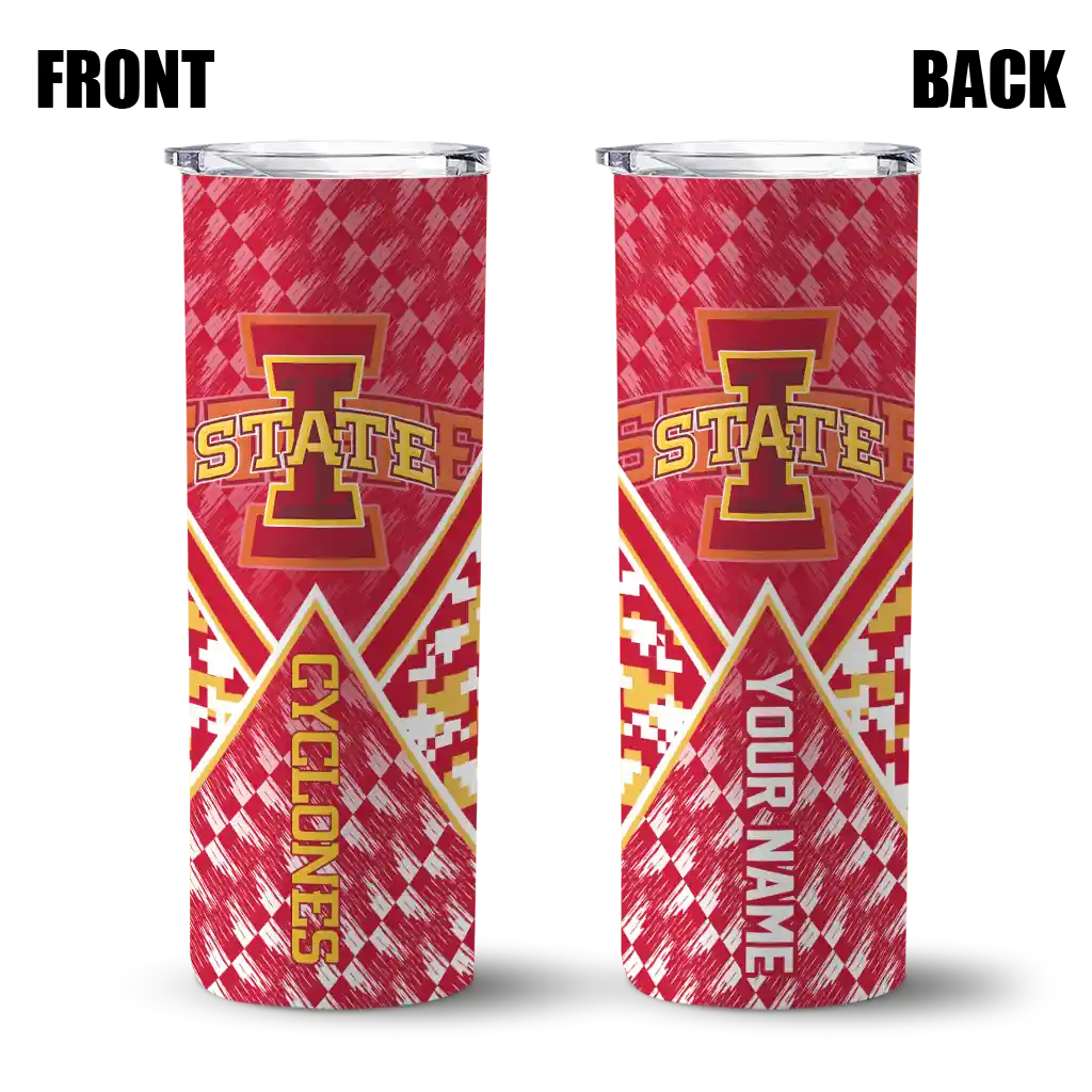 The Personalized Iowa State Cyclones Starburst Tiles Red Skinny Tumbler tumbler is the perfect way to stay refreshed while showing off your pride for Iowa State Cyclones. With its double-wall insulation, your drinks stay at the right temperature for hours, whether you're enjoying a hot coffee or keeping your iced drink cold. What's inside? You’ll find 1 stainless steel tumbler, 1 clear lid, and 1 removable straw. It's the perfect blend of function and fan spirit! Ergonomically designed for comfort, made from durable stainless steel, and insulated to maintain your drink’s temperature, this tumbler is a must-have for any dedicated NCAA fan.