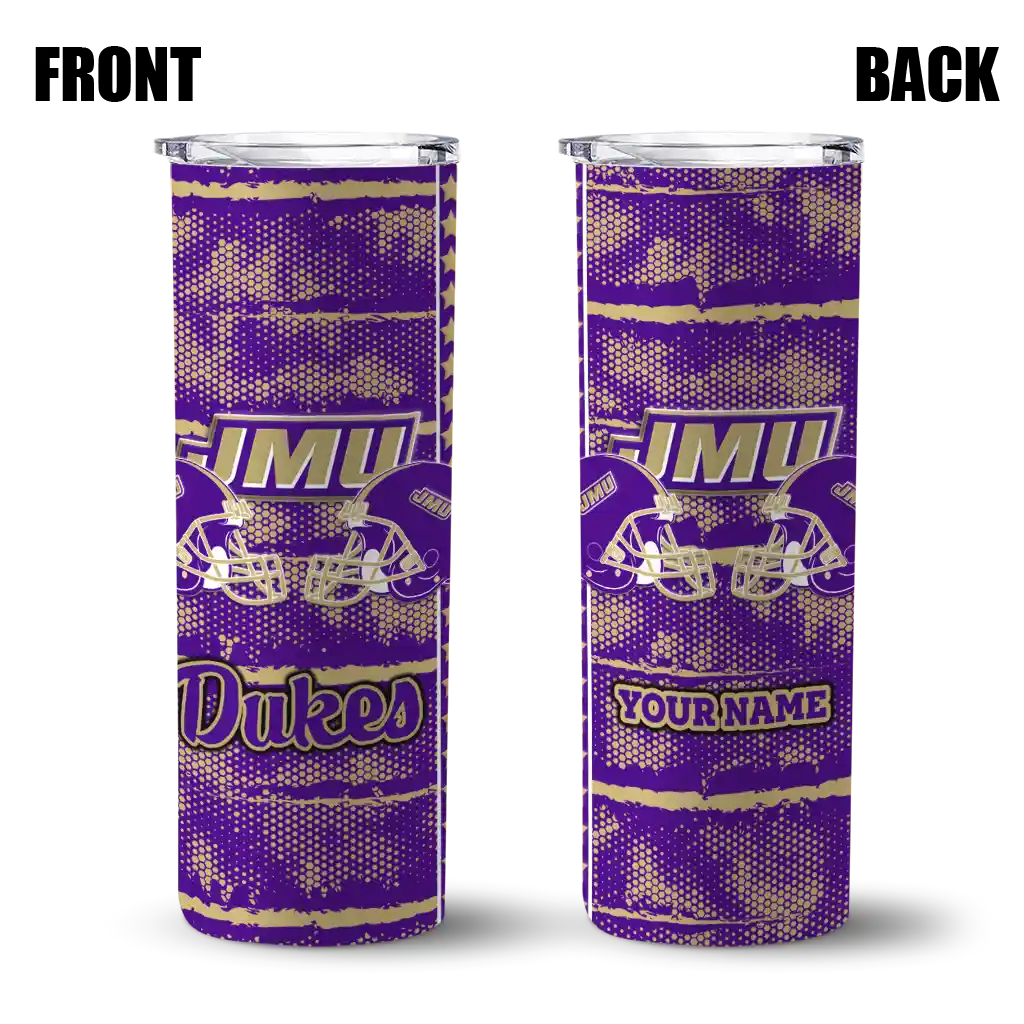The Custom James Madison Dukes Helmet Belt Purple Black Skinny Tumbler tumbler is the perfect way to stay refreshed while showing off your pride for James Madison Dukes. With its double-wall insulation, your drinks stay at the right temperature for hours, whether you're enjoying a hot coffee or keeping your iced drink cold. What's inside? You’ll find 1 stainless steel tumbler, 1 clear lid, and 1 removable straw. It's the perfect blend of function and fan spirit! Ergonomically designed for comfort, made from durable stainless steel, and insulated to maintain your drink’s temperature, this tumbler is a must-have for any dedicated NCAA fan.