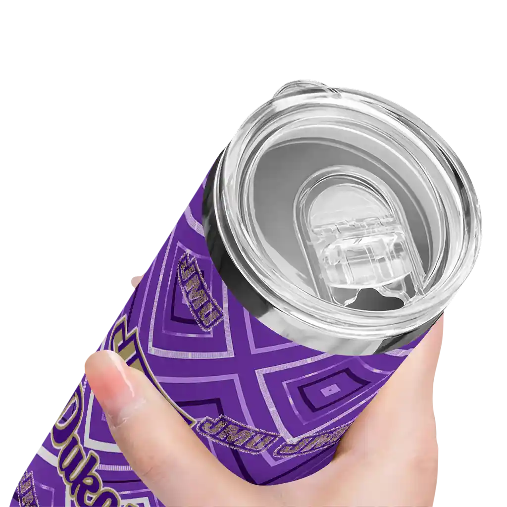 Introducing the James Madison Dukes Tumblers from NCAA Fan Pro —where fan pride meets practical design. This slim tumbler is created for NCAA fans who want their drinks at the perfect temperature while displaying their school pride. The double-wall insulation ensures your hot beverages stay warm and your cold drinks stay chilled for hours, so you can enjoy your drinks at their best, whether you're at a game, tailgate, or on the go.