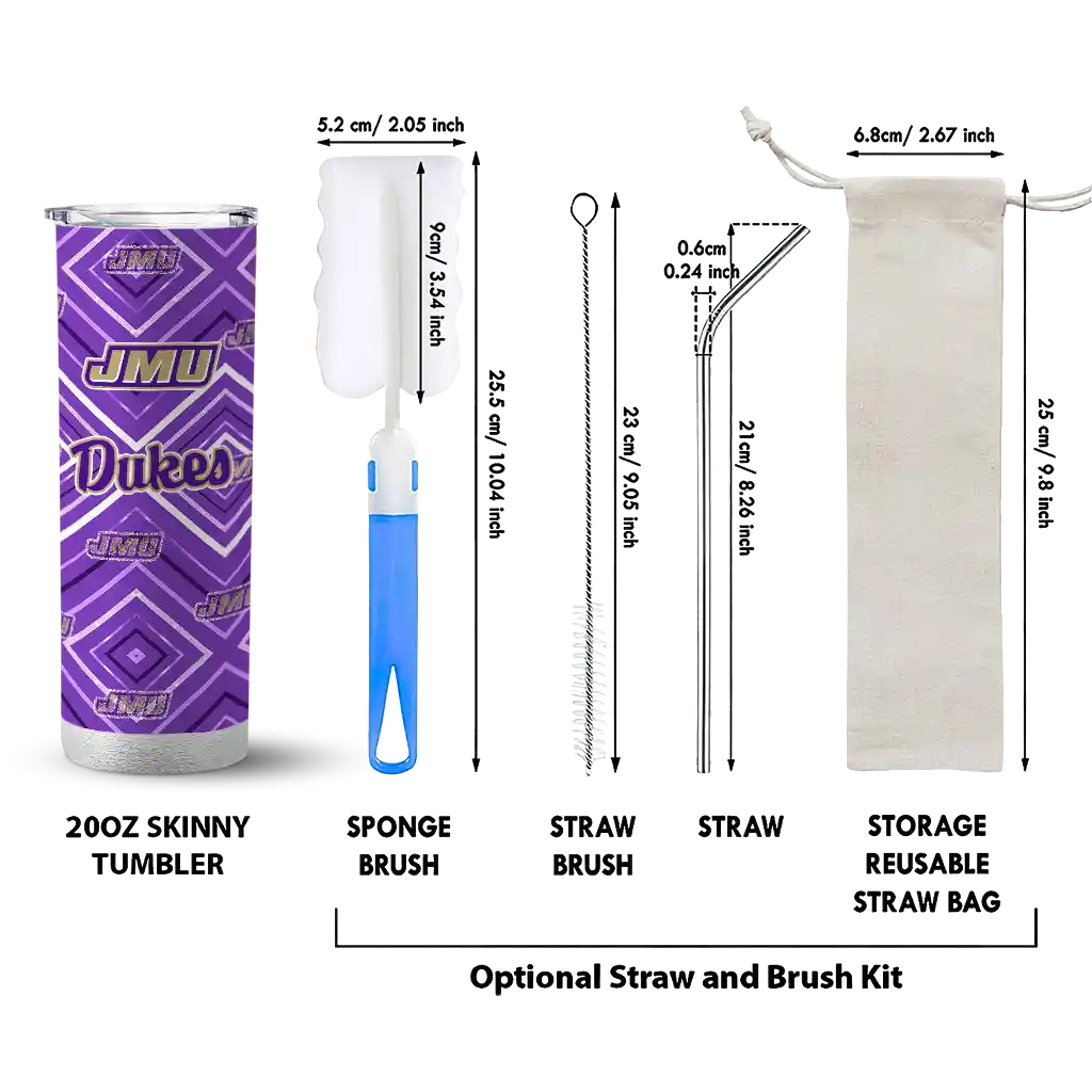 The Custom James Madison Dukes Sparkle Drip Purple Skinny Tumbler tumbler is the perfect way to stay refreshed while showing off your pride for James Madison Dukes. With its double-wall insulation, your drinks stay at the right temperature for hours, whether you're enjoying a hot coffee or keeping your iced drink cold. What's inside? You’ll find 1 stainless steel tumbler, 1 clear lid, and 1 removable straw. It's the perfect blend of function and fan spirit! Ergonomically designed for comfort, made from durable stainless steel, and insulated to maintain your drink’s temperature, this tumbler is a must-have for any dedicated NCAA fan.