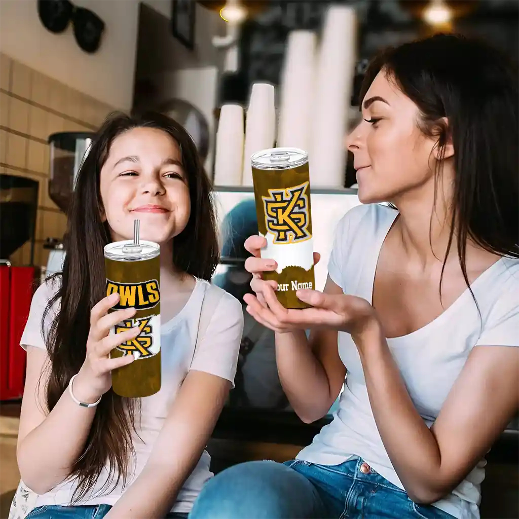 No question about it—the Personalized Kennesaw State Owls Claw Cut Gold Black Curved Tumbler is the ultimate way to stay refreshed while rocking your Kennesaw State Owls pride. From the stadium to your tailgate, or just chilling at home, this sleek tumbler makes sure you stay hydrated in style. What’s in the box? A stainless steel tumbler, clear lid, and removable straw—all the essentials for keeping your favorite drinks on point!