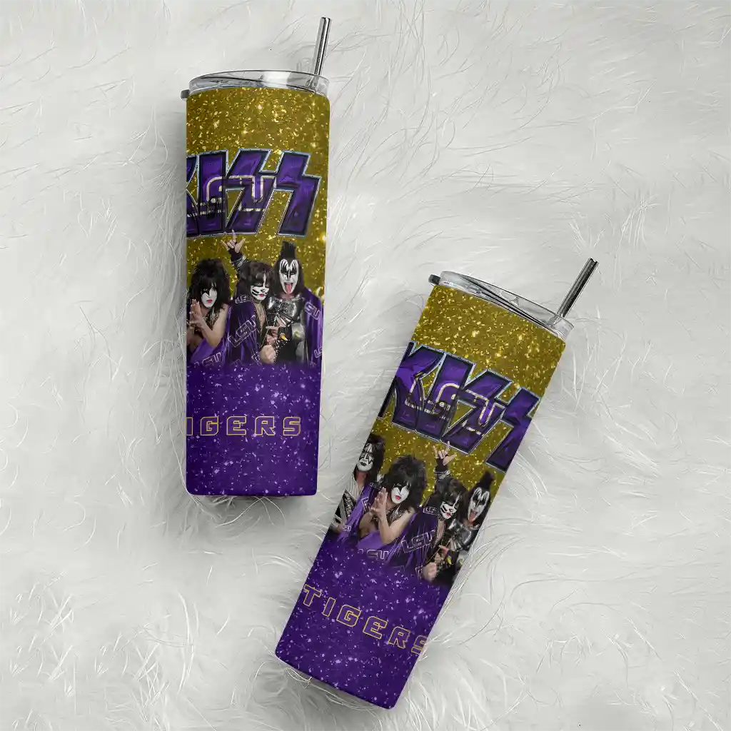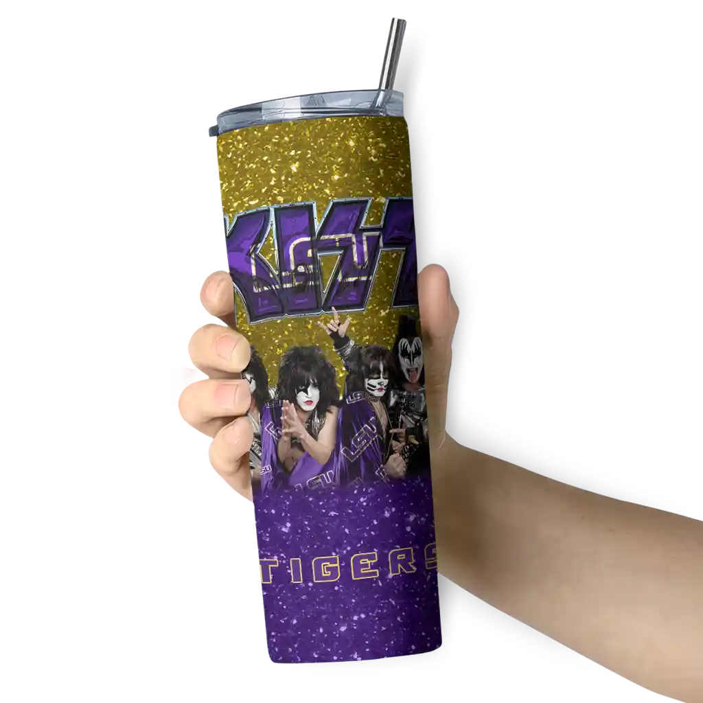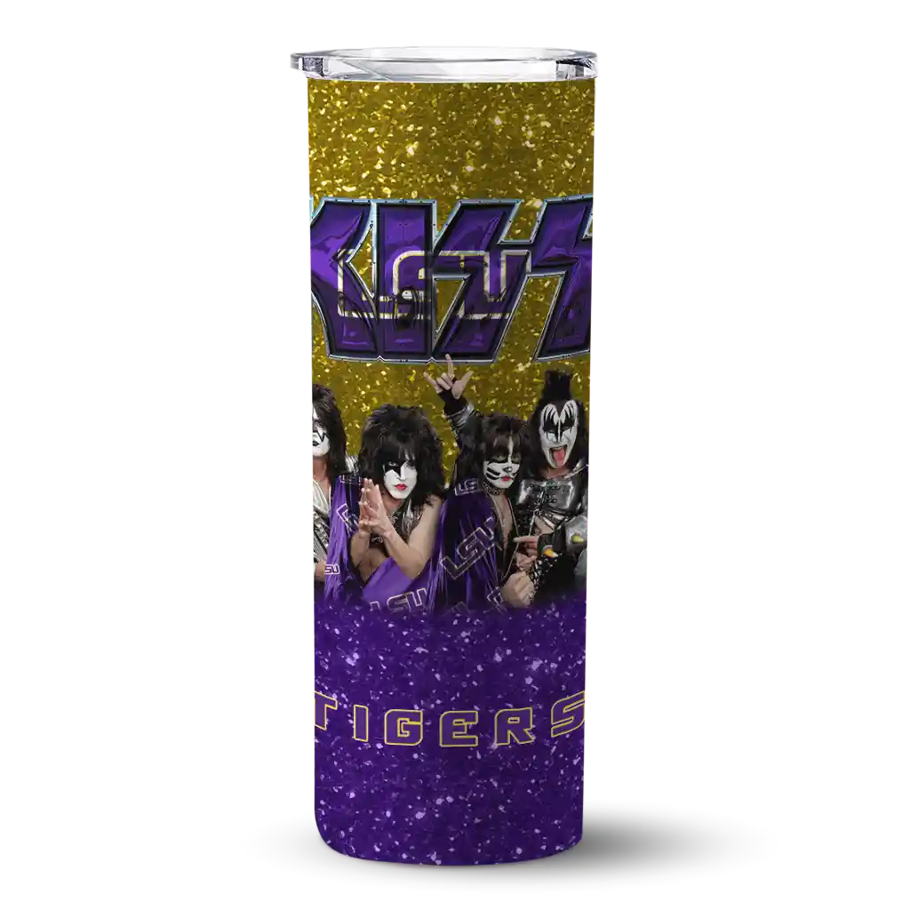 The Customized LSU Tigers Kiss Band Gold Skinny Tumbler tumbler is the perfect way to stay refreshed while showing off your pride for LSU Tigers. With its double-wall insulation, your drinks stay at the right temperature for hours, whether you're enjoying a hot coffee or keeping your iced drink cold. What's inside? You’ll find 1 stainless steel tumbler, 1 clear lid, and 1 removable straw. It's the perfect blend of function and fan spirit! Ergonomically designed for comfort, made from durable stainless steel, and insulated to maintain your drink’s temperature, this tumbler is a must-have for any dedicated NCAA fan.