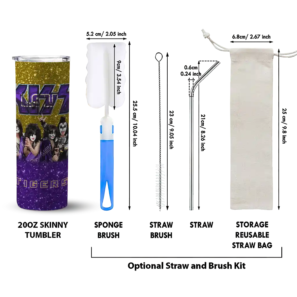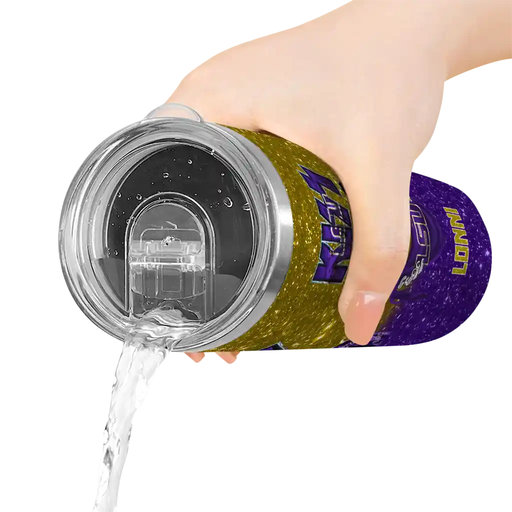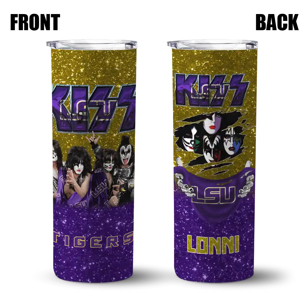 The Customized LSU Tigers Kiss Band Gold Skinny Tumbler tumbler is the perfect way to stay refreshed while showing off your pride for LSU Tigers. With its double-wall insulation, your drinks stay at the right temperature for hours, whether you're enjoying a hot coffee or keeping your iced drink cold. What's inside? You’ll find 1 stainless steel tumbler, 1 clear lid, and 1 removable straw. It's the perfect blend of function and fan spirit! Ergonomically designed for comfort, made from durable stainless steel, and insulated to maintain your drink’s temperature, this tumbler is a must-have for any dedicated NCAA fan.