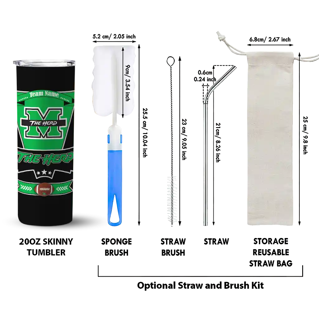 The Customized Marshall Thundering Herd Helmet Belt Green Black Skinny Tumbler tumbler is the perfect way to stay refreshed while showing off your pride for Marshall Thundering Herd. With its double-wall insulation, your drinks stay at the right temperature for hours, whether you're enjoying a hot coffee or keeping your iced drink cold. What's inside? You’ll find 1 stainless steel tumbler, 1 clear lid, and 1 removable straw. It's the perfect blend of function and fan spirit! Ergonomically designed for comfort, made from durable stainless steel, and insulated to maintain your drink’s temperature, this tumbler is a must-have for any dedicated NCAA fan.