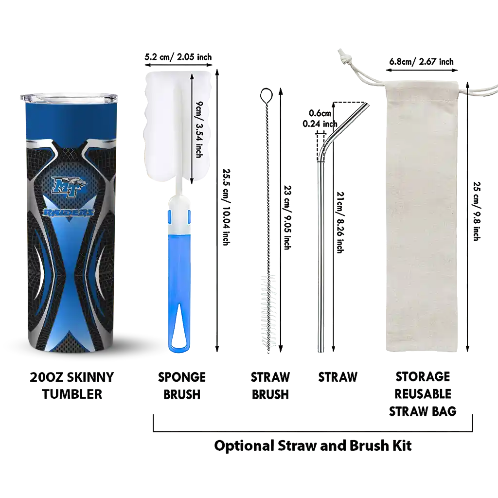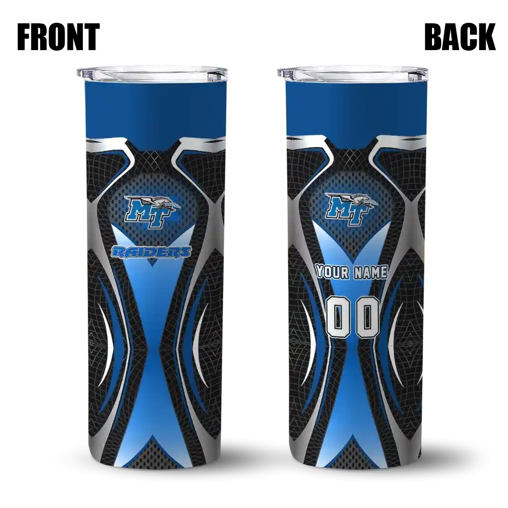 The Customized Middle Tennessee Blue Raiders Star Cluster Blue Skinny Tumbler tumbler is the perfect way to stay refreshed while showing off your pride for Middle Tennessee Blue Raiders. With its double-wall insulation, your drinks stay at the right temperature for hours, whether you're enjoying a hot coffee or keeping your iced drink cold. What's inside? You’ll find 1 stainless steel tumbler, 1 clear lid, and 1 removable straw. It's the perfect blend of function and fan spirit! Ergonomically designed for comfort, made from durable stainless steel, and insulated to maintain your drink’s temperature, this tumbler is a must-have for any dedicated NCAA fan.
