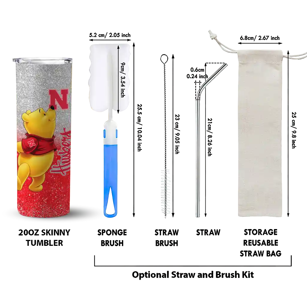 The Customized Nebraska Cornhuskers Winnie the Pooh Red Gray Skinny Tumbler tumbler is the perfect way to stay refreshed while showing off your pride for Nebraska Cornhuskers. With its double-wall insulation, your drinks stay at the right temperature for hours, whether you're enjoying a hot coffee or keeping your iced drink cold. What's inside? You’ll find 1 stainless steel tumbler, 1 clear lid, and 1 removable straw. It's the perfect blend of function and fan spirit! Ergonomically designed for comfort, made from durable stainless steel, and insulated to maintain your drink’s temperature, this tumbler is a must-have for any dedicated NCAA fan.