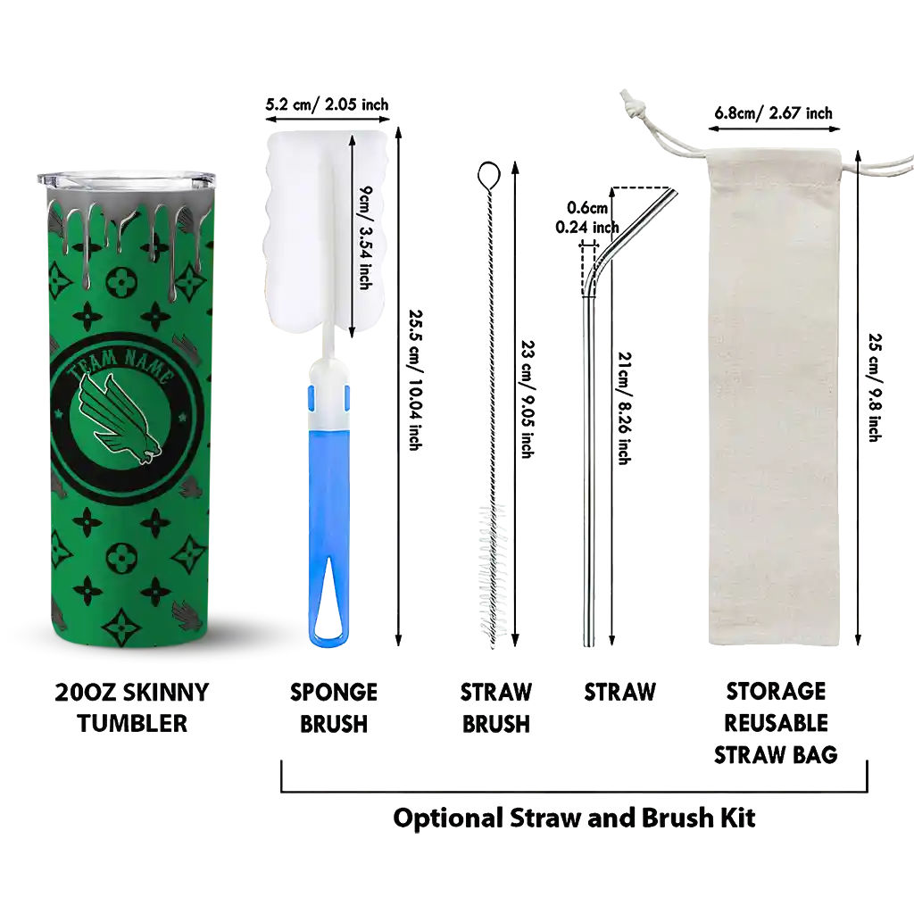 The Personalized North Texas Mean Green Chevron Stripes Green Skinny Tumbler tumbler is the perfect way to stay refreshed while showing off your pride for North Texas Mean Green. With its double-wall insulation, your drinks stay at the right temperature for hours, whether you're enjoying a hot coffee or keeping your iced drink cold. What's inside? You’ll find 1 stainless steel tumbler, 1 clear lid, and 1 removable straw. It's the perfect blend of function and fan spirit! Ergonomically designed for comfort, made from durable stainless steel, and insulated to maintain your drink’s temperature, this tumbler is a must-have for any dedicated NCAA fan.