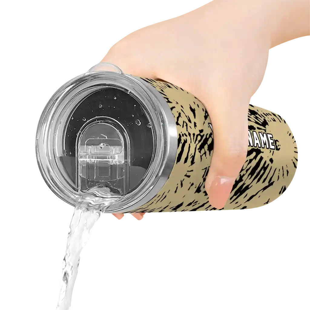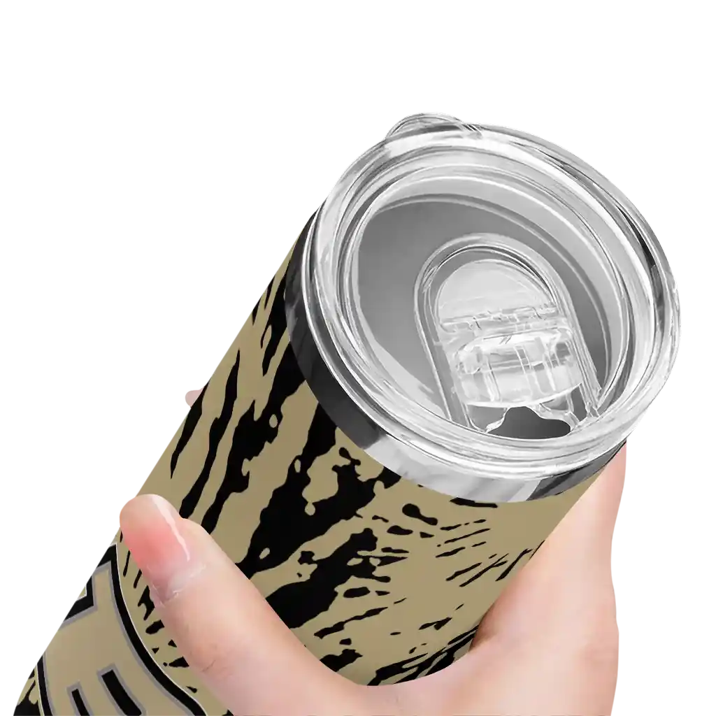 The Custom Purdue Boilermakers Camo Streak Gold Skinny Tumbler tumbler is the perfect way to stay refreshed while showing off your pride for Purdue Boilermakers. With its double-wall insulation, your drinks stay at the right temperature for hours, whether you're enjoying a hot coffee or keeping your iced drink cold. What's inside? You’ll find 1 stainless steel tumbler, 1 clear lid, and 1 removable straw. It's the perfect blend of function and fan spirit! Ergonomically designed for comfort, made from durable stainless steel, and insulated to maintain your drink’s temperature, this tumbler is a must-have for any dedicated NCAA fan.
