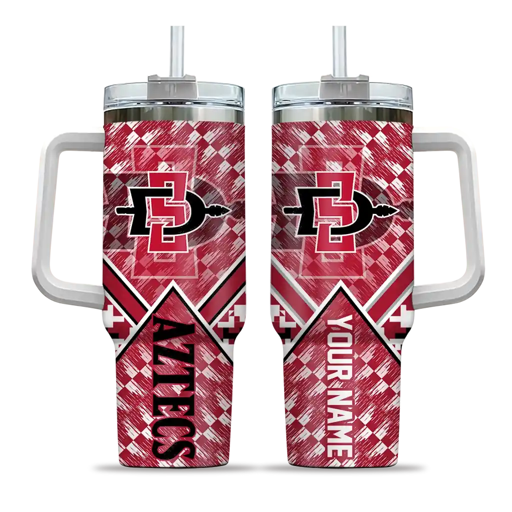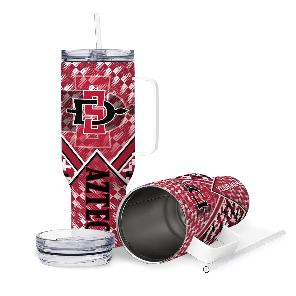 The San Diego State Aztecs Curved Tumbler – Custom Bold Diamonds Red is a double-wall insulated stainless steel tumbler designed to maintain your beverage’s ideal temperature. It features an ergonomic curved design for an easy grip and a tough stainless steel build. The item includes the tumbler, a clear lid, and a removable straw. It is easy to clean and low-maintenance. You can personalize this tumbler by adding both a custom name and number of your choice during the ordering process.