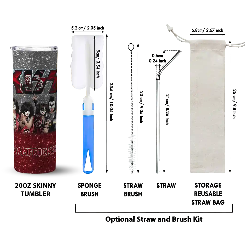 The Customized South Carolina Gamecocks Kiss Band Black Skinny Tumbler tumbler is the perfect way to stay refreshed while showing off your pride for South Carolina Gamecocks. With its double-wall insulation, your drinks stay at the right temperature for hours, whether you're enjoying a hot coffee or keeping your iced drink cold. What's inside? You’ll find 1 stainless steel tumbler, 1 clear lid, and 1 removable straw. It's the perfect blend of function and fan spirit! Ergonomically designed for comfort, made from durable stainless steel, and insulated to maintain your drink’s temperature, this tumbler is a must-have for any dedicated NCAA fan.