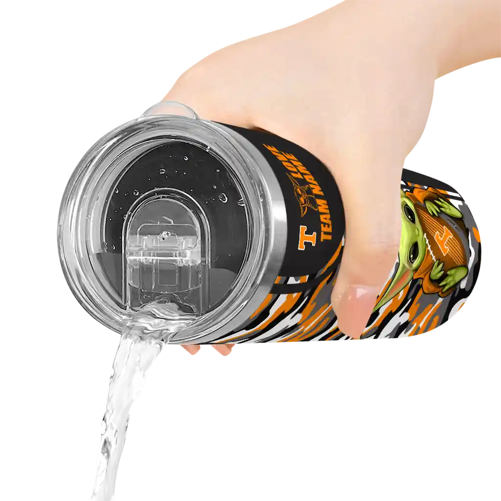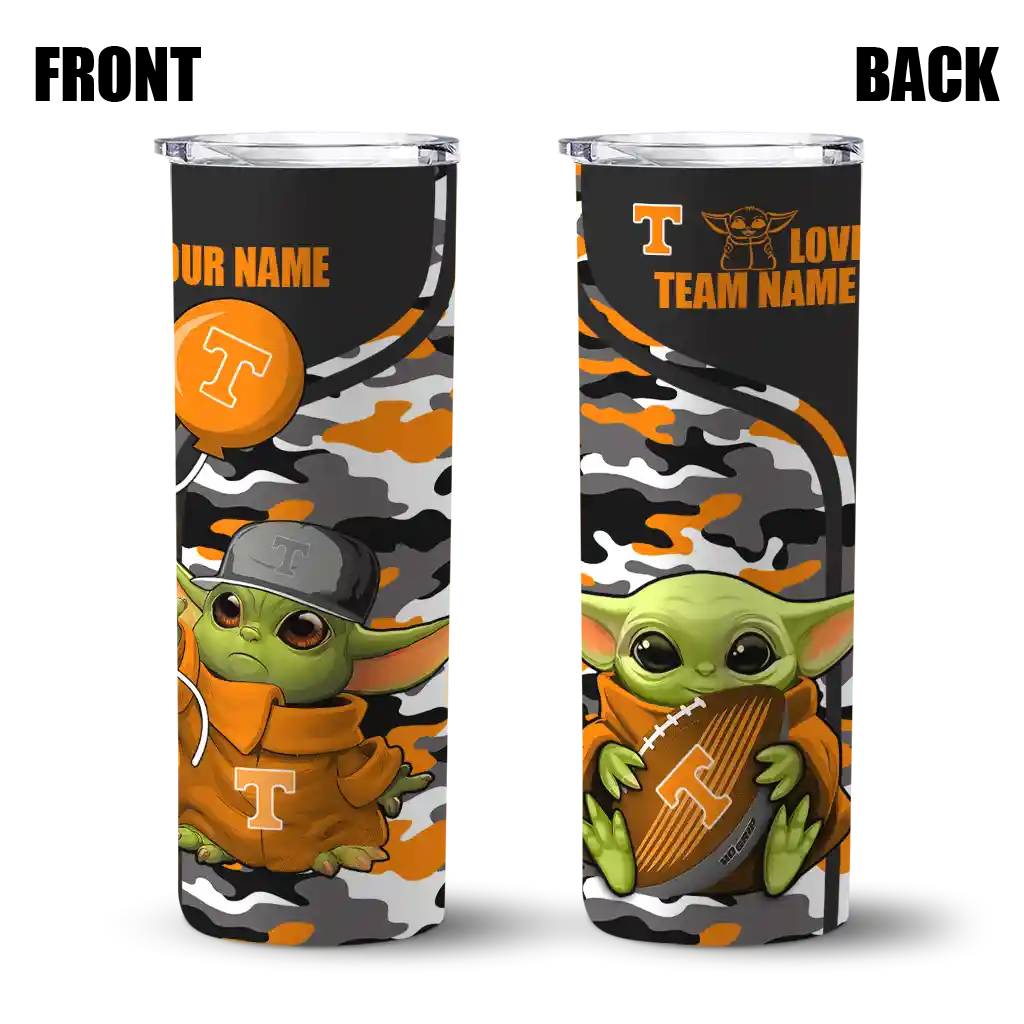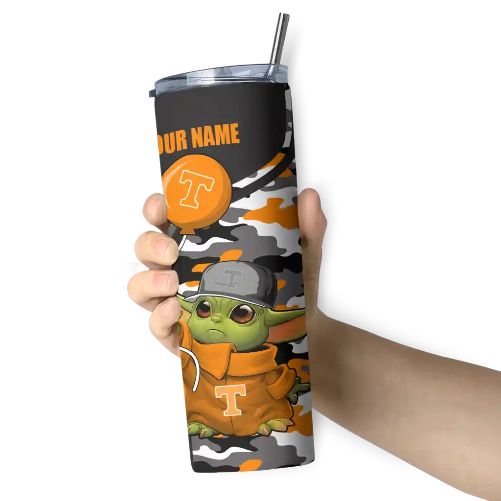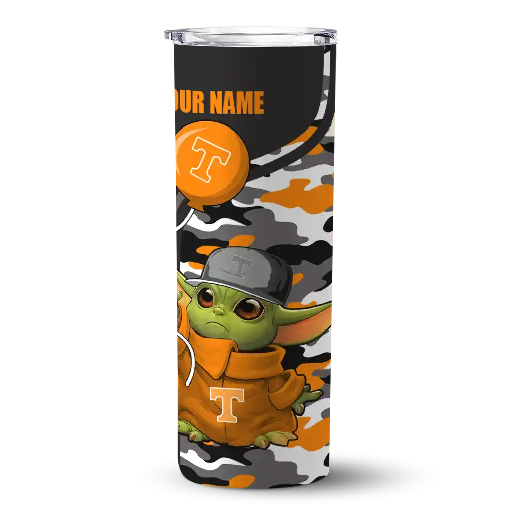 The Customized Tennessee Volunteers Yoda Camo Orange Black Skinny Tumbler tumbler is the perfect way to stay refreshed while showing off your pride for Tennessee Volunteers. With its double-wall insulation, your drinks stay at the right temperature for hours, whether you're enjoying a hot coffee or keeping your iced drink cold. What's inside? You’ll find 1 stainless steel tumbler, 1 clear lid, and 1 removable straw. It's the perfect blend of function and fan spirit! Ergonomically designed for comfort, made from durable stainless steel, and insulated to maintain your drink’s temperature, this tumbler is a must-have for any dedicated NCAA fan.