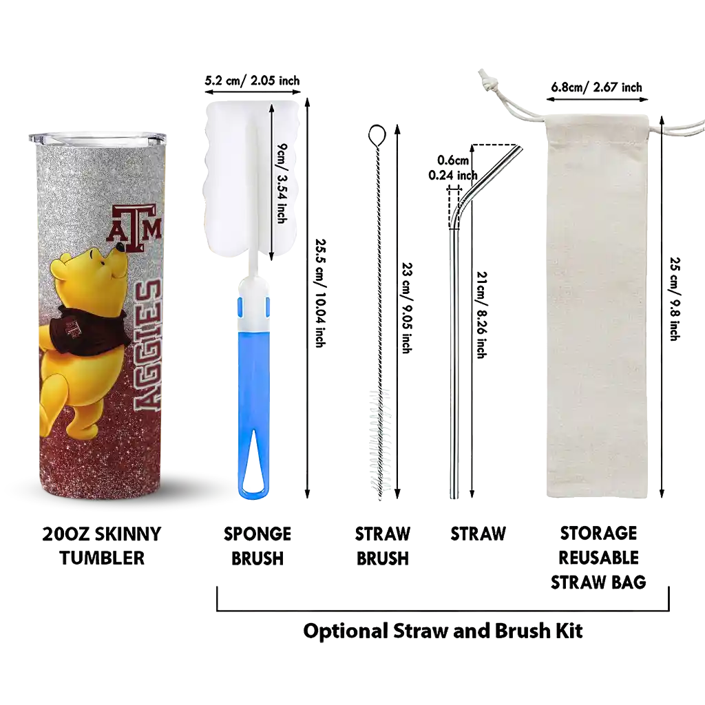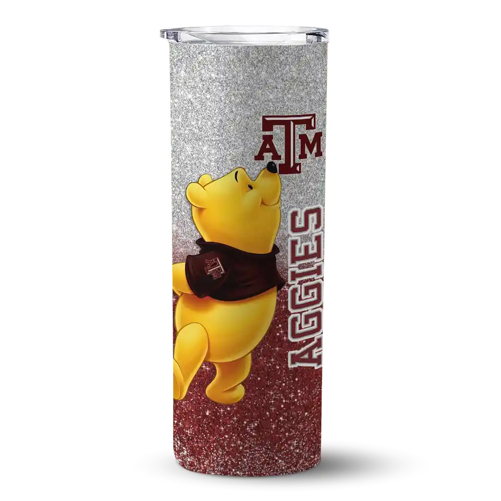 The Customized Texas A&M Aggies Winnie the Pooh Maroon Gray Skinny Tumbler tumbler is the perfect way to stay refreshed while showing off your pride for Texas A&M Aggies. With its double-wall insulation, your drinks stay at the right temperature for hours, whether you're enjoying a hot coffee or keeping your iced drink cold. What's inside? You’ll find 1 stainless steel tumbler, 1 clear lid, and 1 removable straw. It's the perfect blend of function and fan spirit! Ergonomically designed for comfort, made from durable stainless steel, and insulated to maintain your drink’s temperature, this tumbler is a must-have for any dedicated NCAA fan.