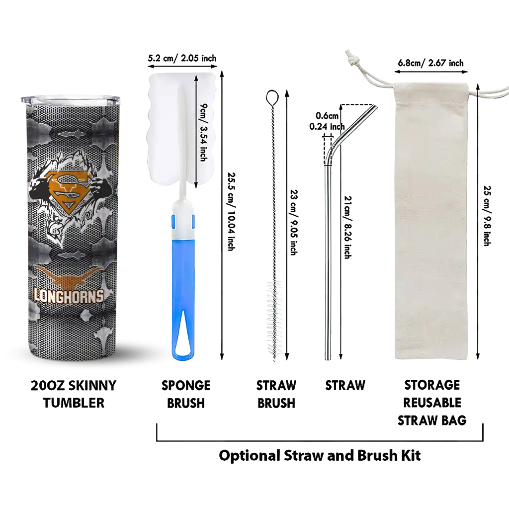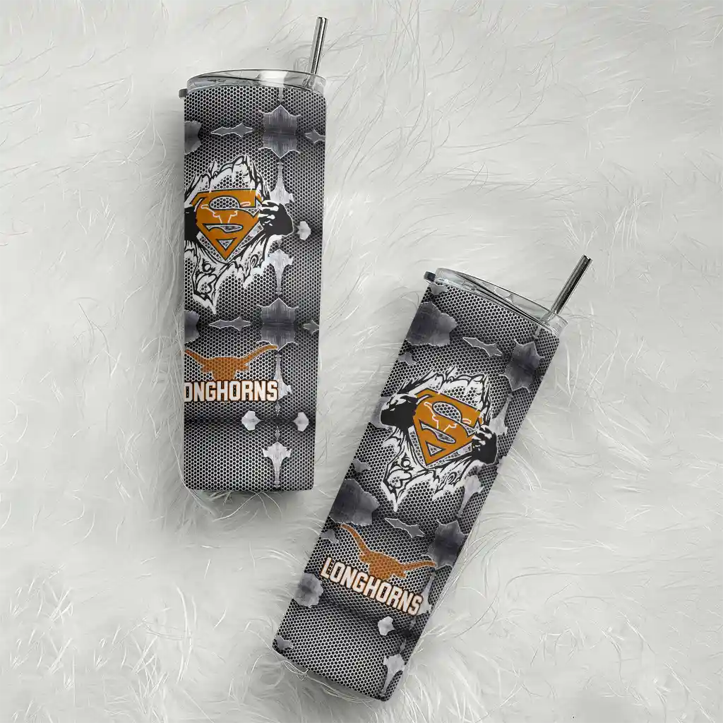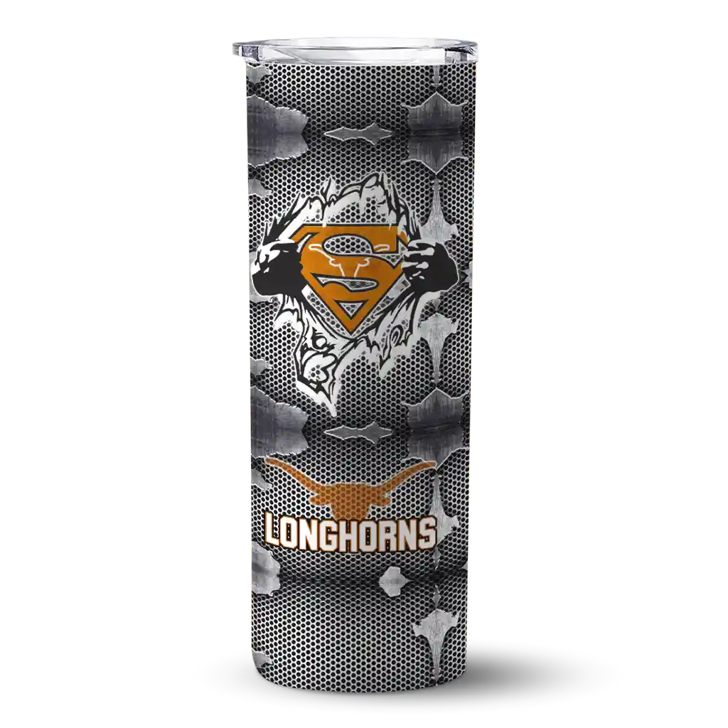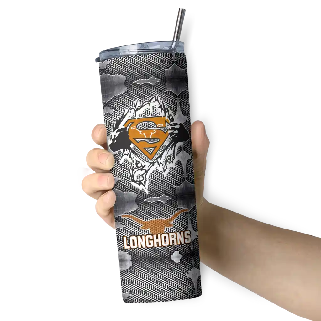 The Personalized Texas Longhorns Superman Emblem Orange Black Skinny Tumbler tumbler is the perfect way to stay refreshed while showing off your pride for Texas Longhorns. With its double-wall insulation, your drinks stay at the right temperature for hours, whether you're enjoying a hot coffee or keeping your iced drink cold. What's inside? You’ll find 1 stainless steel tumbler, 1 clear lid, and 1 removable straw. It's the perfect blend of function and fan spirit! Ergonomically designed for comfort, made from durable stainless steel, and insulated to maintain your drink’s temperature, this tumbler is a must-have for any dedicated NCAA fan.