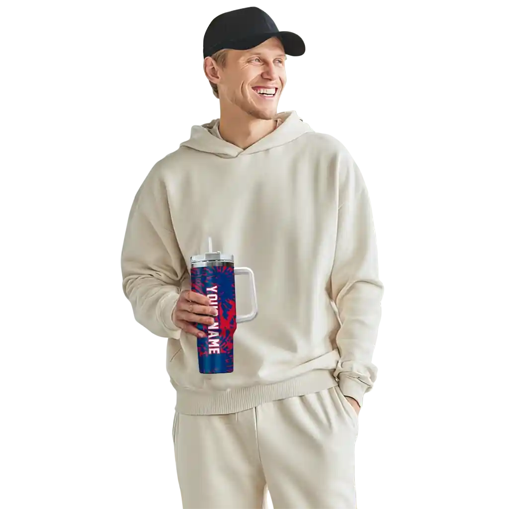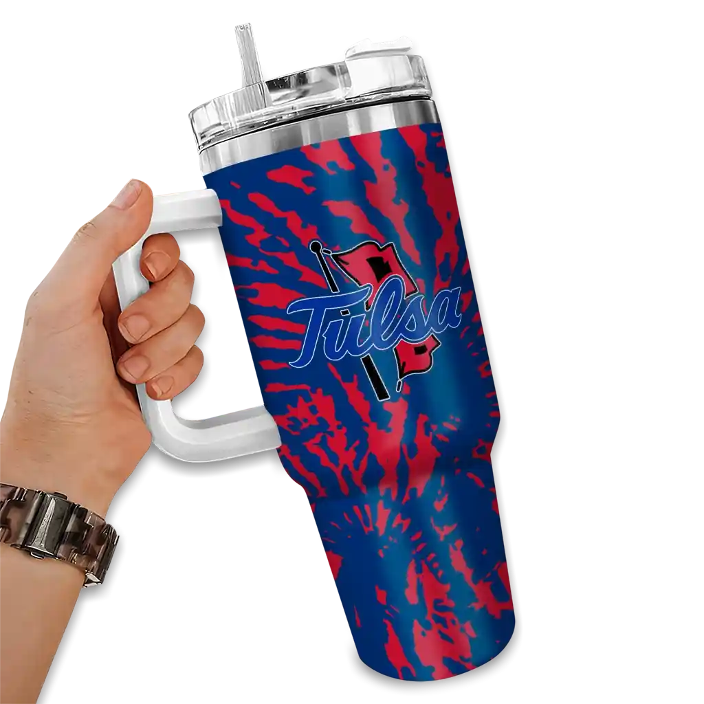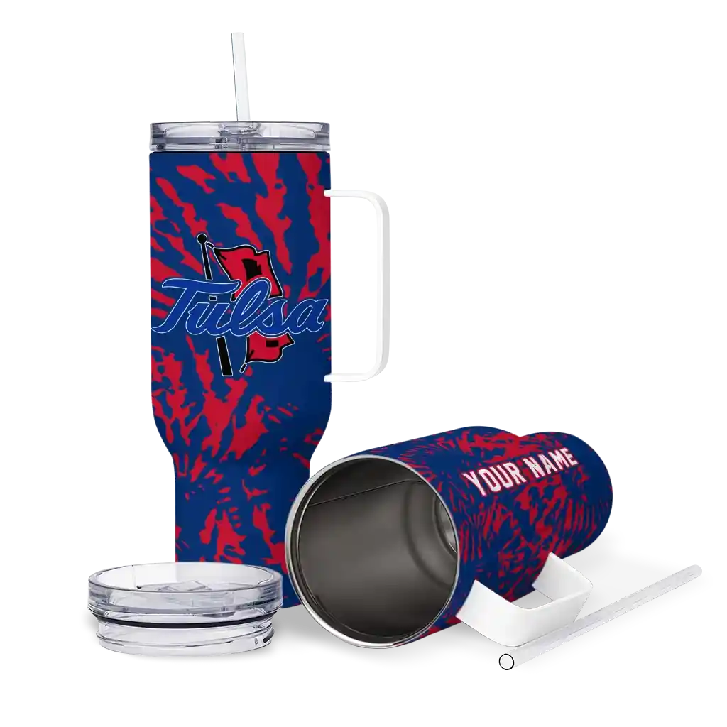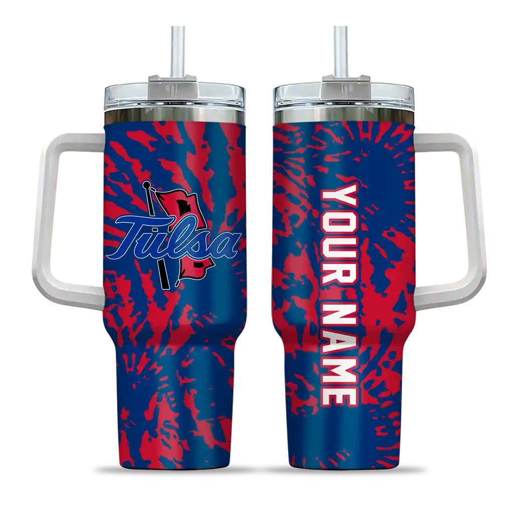 The Tulsa Golden Hurricane Curved Tumbler – Customized Burst Swirl Blue is a double-wall insulated stainless steel tumbler designed to maintain your beverage’s ideal temperature. It features an ergonomic curved design for an easy grip and a tough stainless steel build. The item includes the tumbler, a clear lid, and a removable straw. It is easy to clean and low-maintenance. You can personalize this tumbler by adding both a custom name and number of your choice during the ordering process.