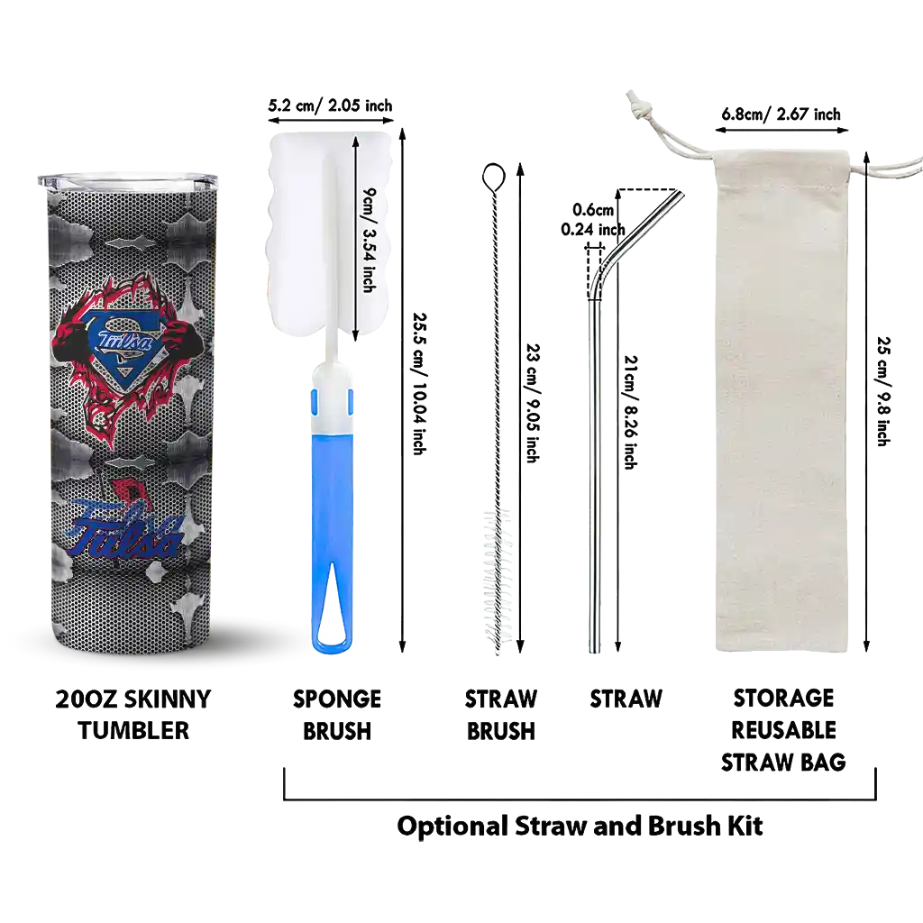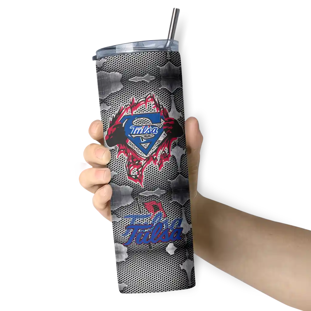 The Customized Tulsa Golden Hurricane Chevron V Blue Gray Skinny Tumbler tumbler is the perfect way to stay refreshed while showing off your pride for Tulsa Golden Hurricane. With its double-wall insulation, your drinks stay at the right temperature for hours, whether you're enjoying a hot coffee or keeping your iced drink cold. What's inside? You’ll find 1 stainless steel tumbler, 1 clear lid, and 1 removable straw. It's the perfect blend of function and fan spirit! Ergonomically designed for comfort, made from durable stainless steel, and insulated to maintain your drink’s temperature, this tumbler is a must-have for any dedicated NCAA fan.
